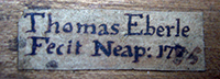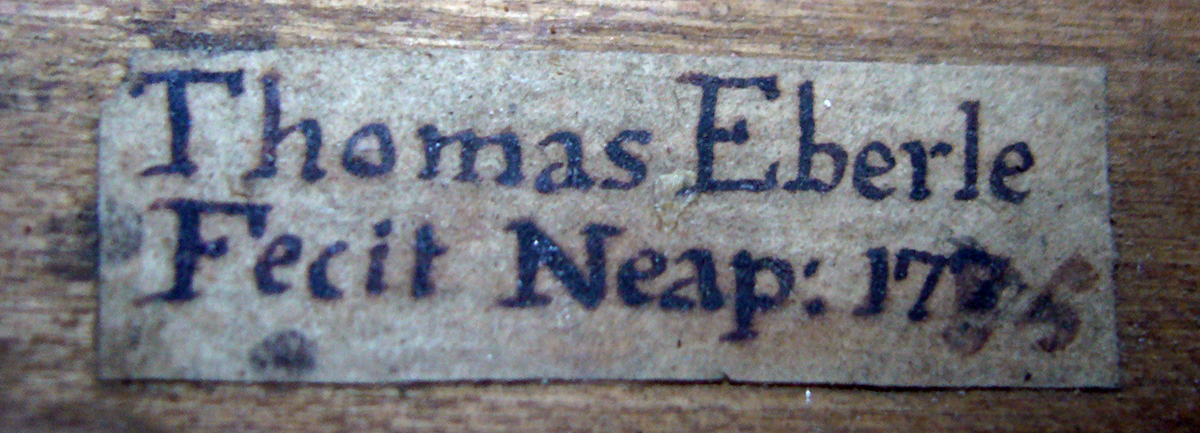 Möller states in his certificate that 'This instrument, which is characteristic for this maker's fine workmanship, is in an excellent state of preservation'. It is to be noted that on the label Eberle reverts to his native German spelling of his first name (Thomas) as opposed to the Italianisation of his name on some of his other labels (Tomasso).