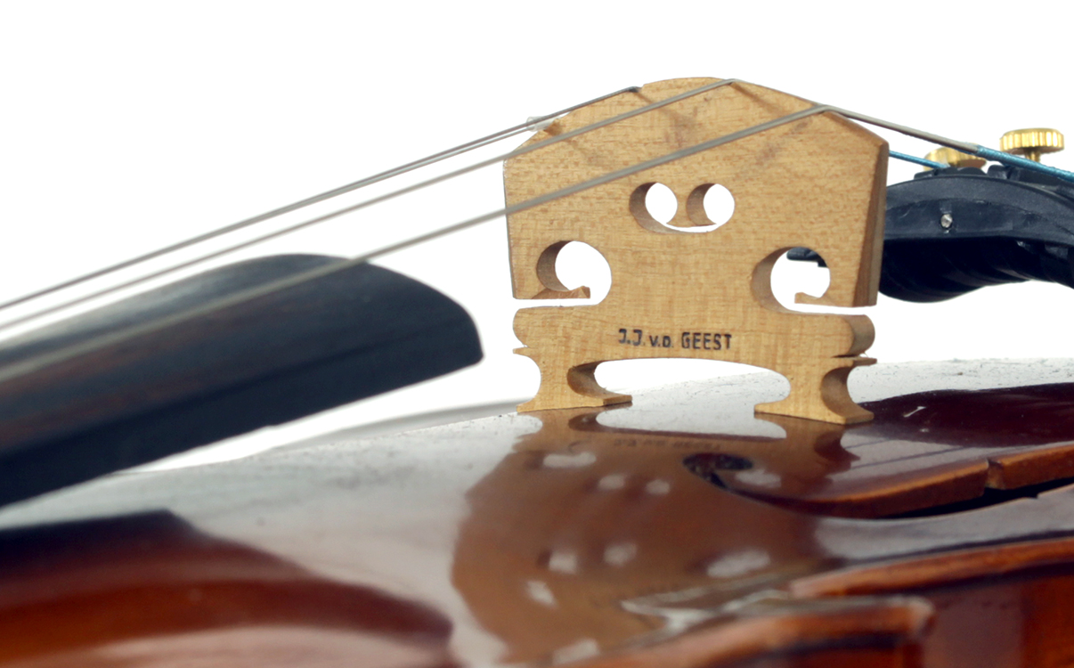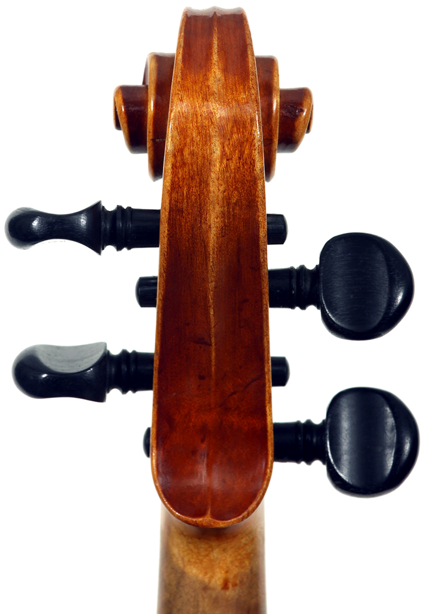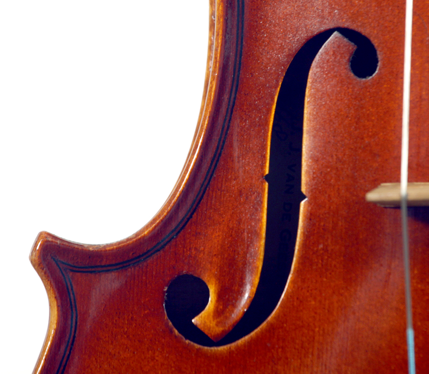 This violin is largely representative of the excellent quality associated with van de Geest imports. It is probably of German origin and workmanship throughout is refined with attention to detail. The reddish brown varnish compliments the wood well. The two-piece back, ribs, neck and scroll appear to be of the same mildly flamed maple with a medium curl. The top is of finely grained tone spruce. The Fs are crisp and elegant with nicely fluted palettes. The bridge is still the original, stamped J J van de Geest