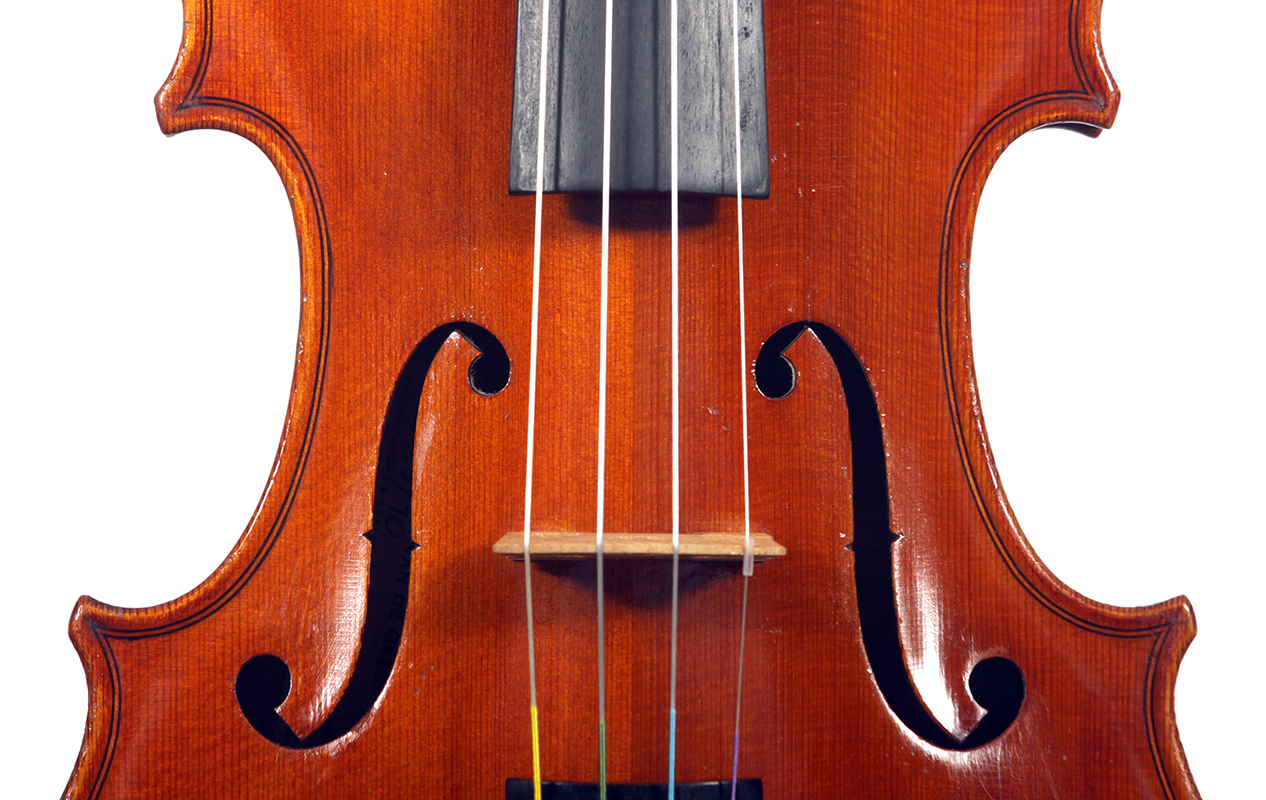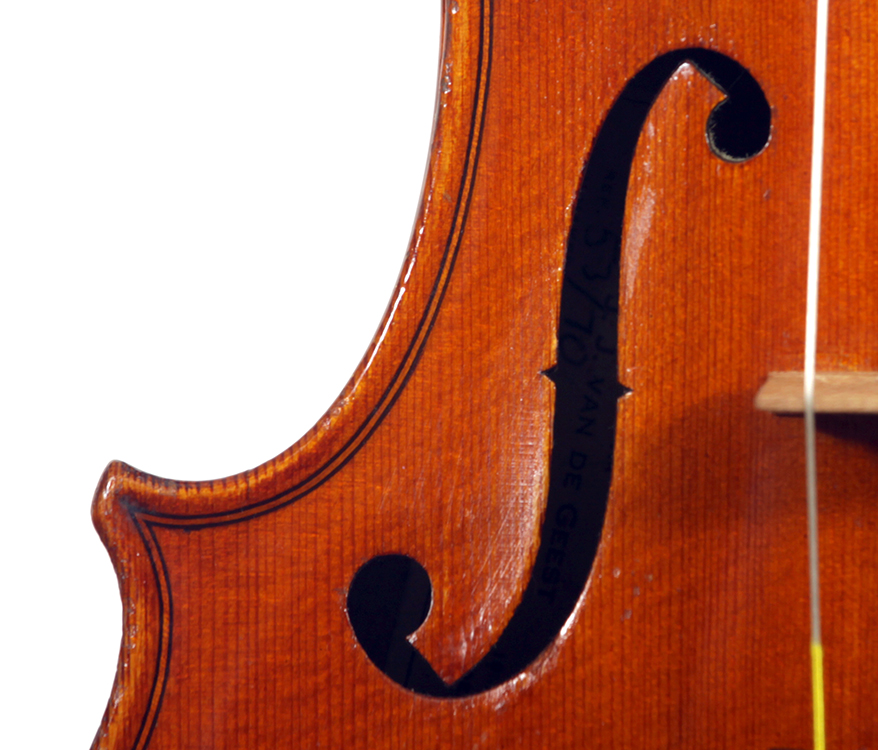 It's not known where Van de Geest sourced this violin from but it is an attractive instrument with a beautiful one piece back and is in impeccable condition. The violin is very responsive with an open and clear tone. Workmanship throughout is refined with attention to the detail of good lutherie.