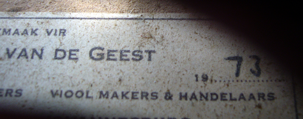 Apart from his own personal output as violinmaker, J. J. van de Geest imported 'trade' instruments (commercial instruments aimed at the student and amateur market) from mainly Germany, Holland and Japan. Such instruments were usually of reasonably good quality and he always labelled them as "Made for J J van de Geest", followed by additional information, such as a serial number, date, address etc. These instruments were NOT made by Van de Geest, but were the output of large trade studios (a euphemism for "factories"). These instruments (including a large number of violas, cellos and child instruments), emerge all over South Africa.