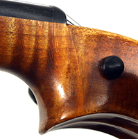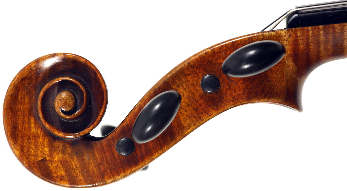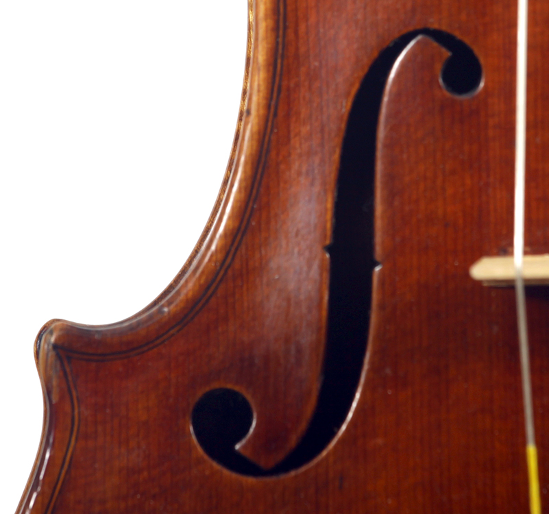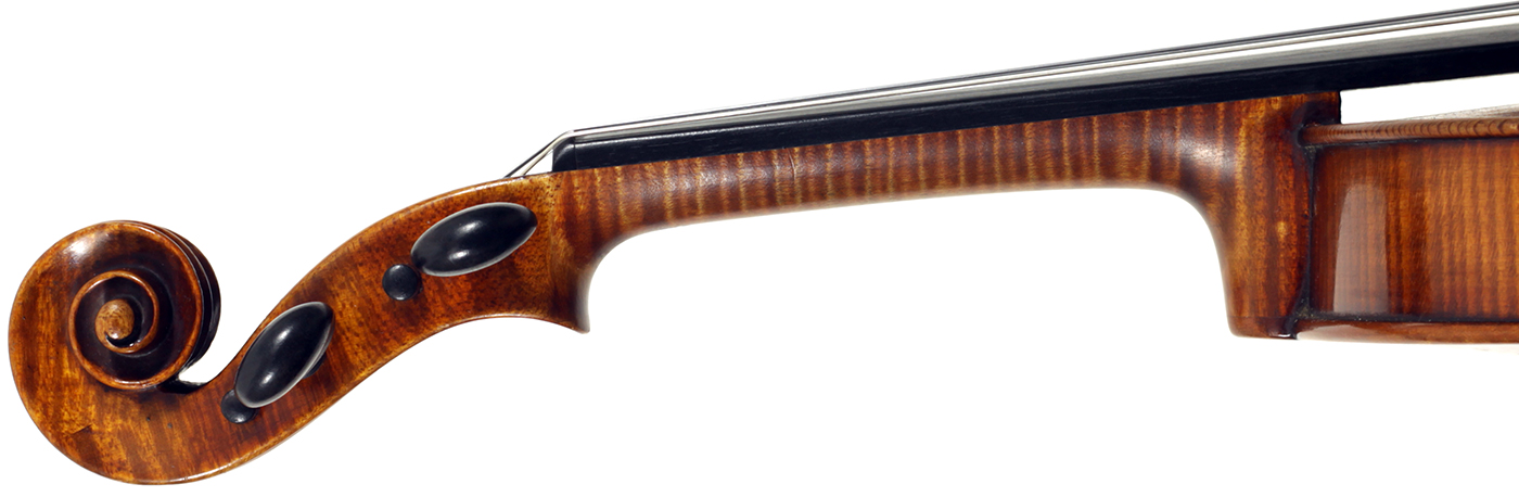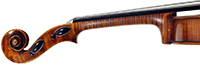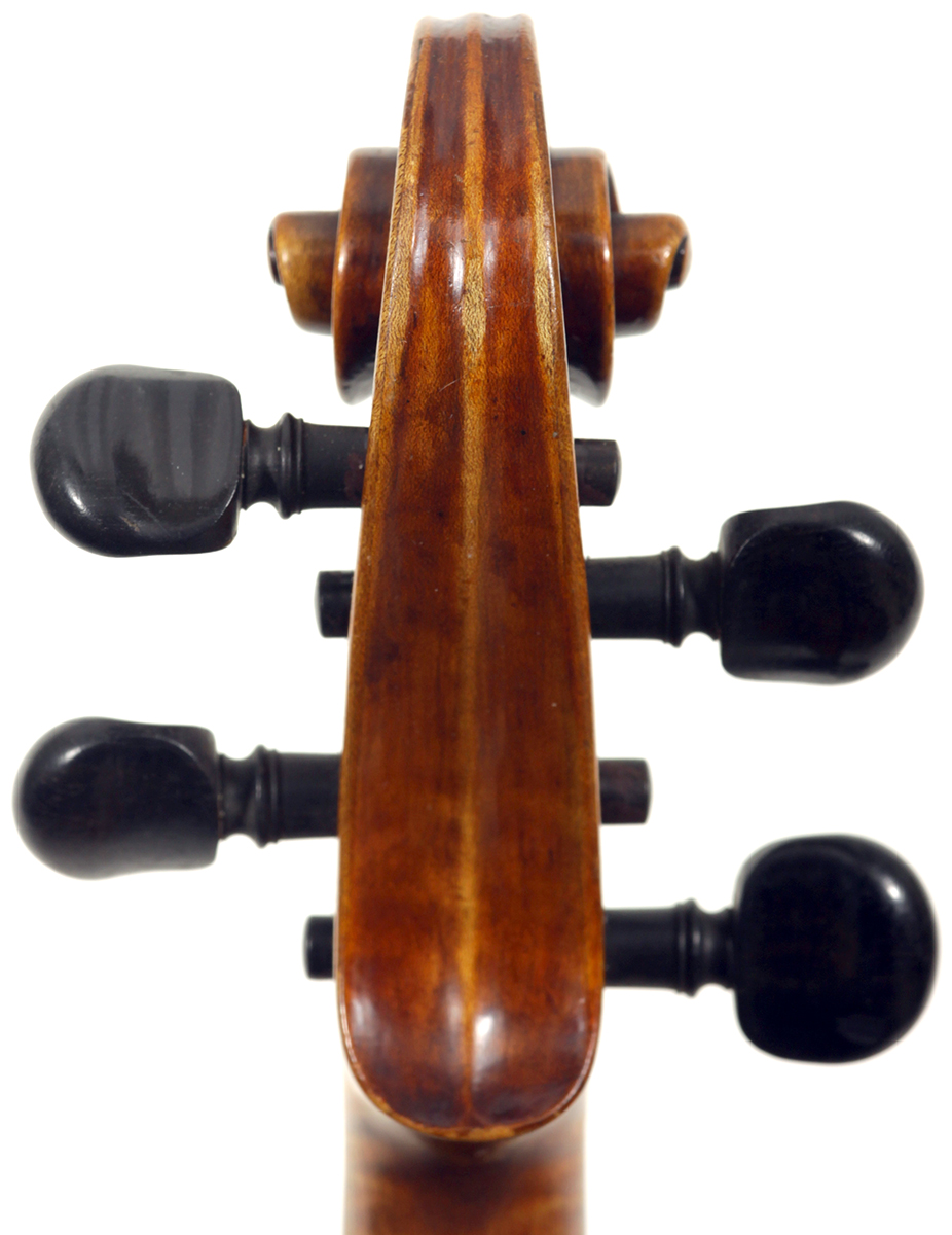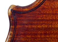 Everything about this instrument speaks of attention to detail: the choice of materials and workmanship are truly excellent throughout. The golden-brown varnish appears to be oil based and of high transparency, beautifully complimenting the wood. The purfling is superbly traced with carefully executed mitres. It's particularly the scroll that impresses - it is beautifully finished and impeccably balanced, with exceptional elegance and refinement.