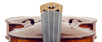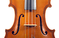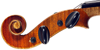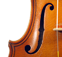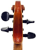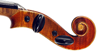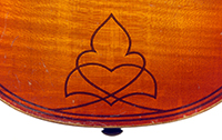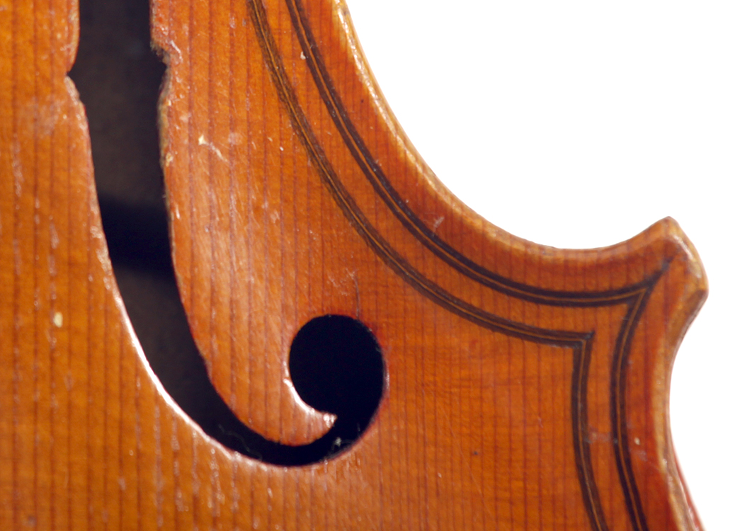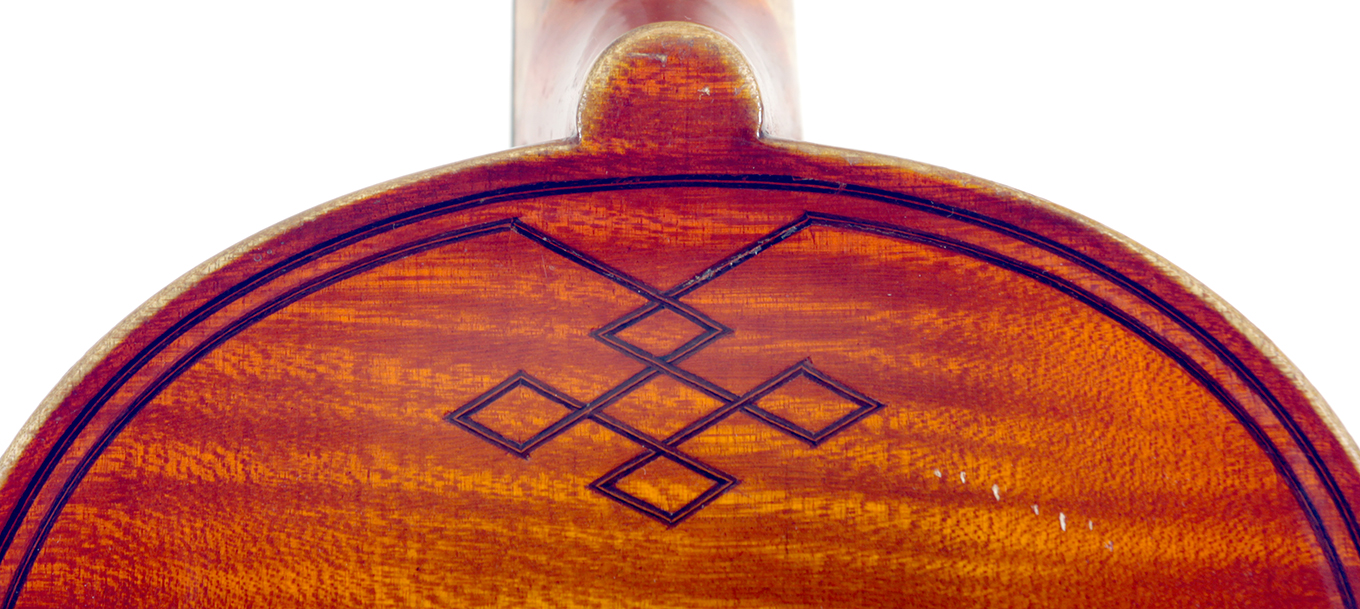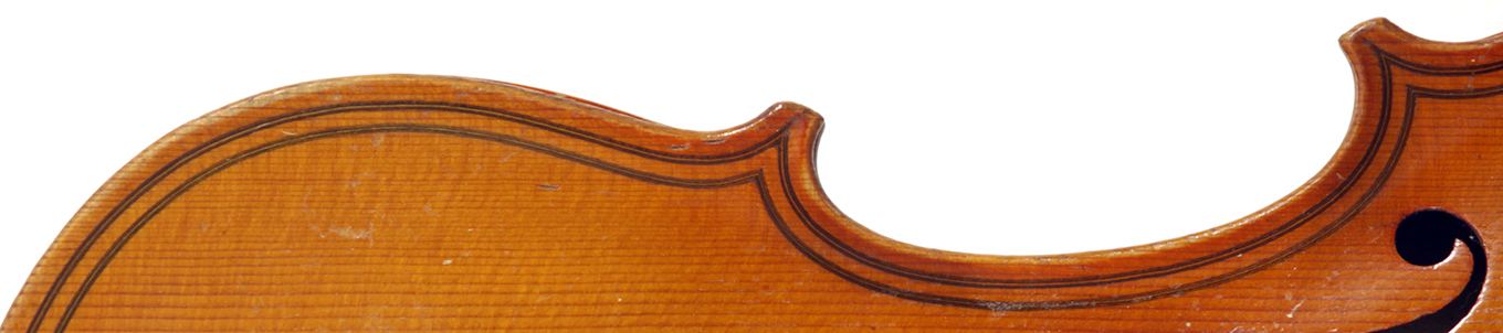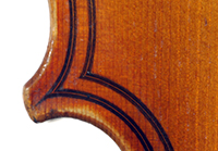 The top is of very good quality tone spruce with a straight and even medium grain. The one piece back, ribs, neck and scroll are of mildly flamed maple. The scroll is highly perfunctory, lacking the additional curl associated with Da Salo's work. The spirit-based varnish is a golden brown with a touch of red in it. The double purfling (a characteristic of Da Salo) is well-traced and tidy, both the front and back. There are also two purfling figures in the back (see photos)