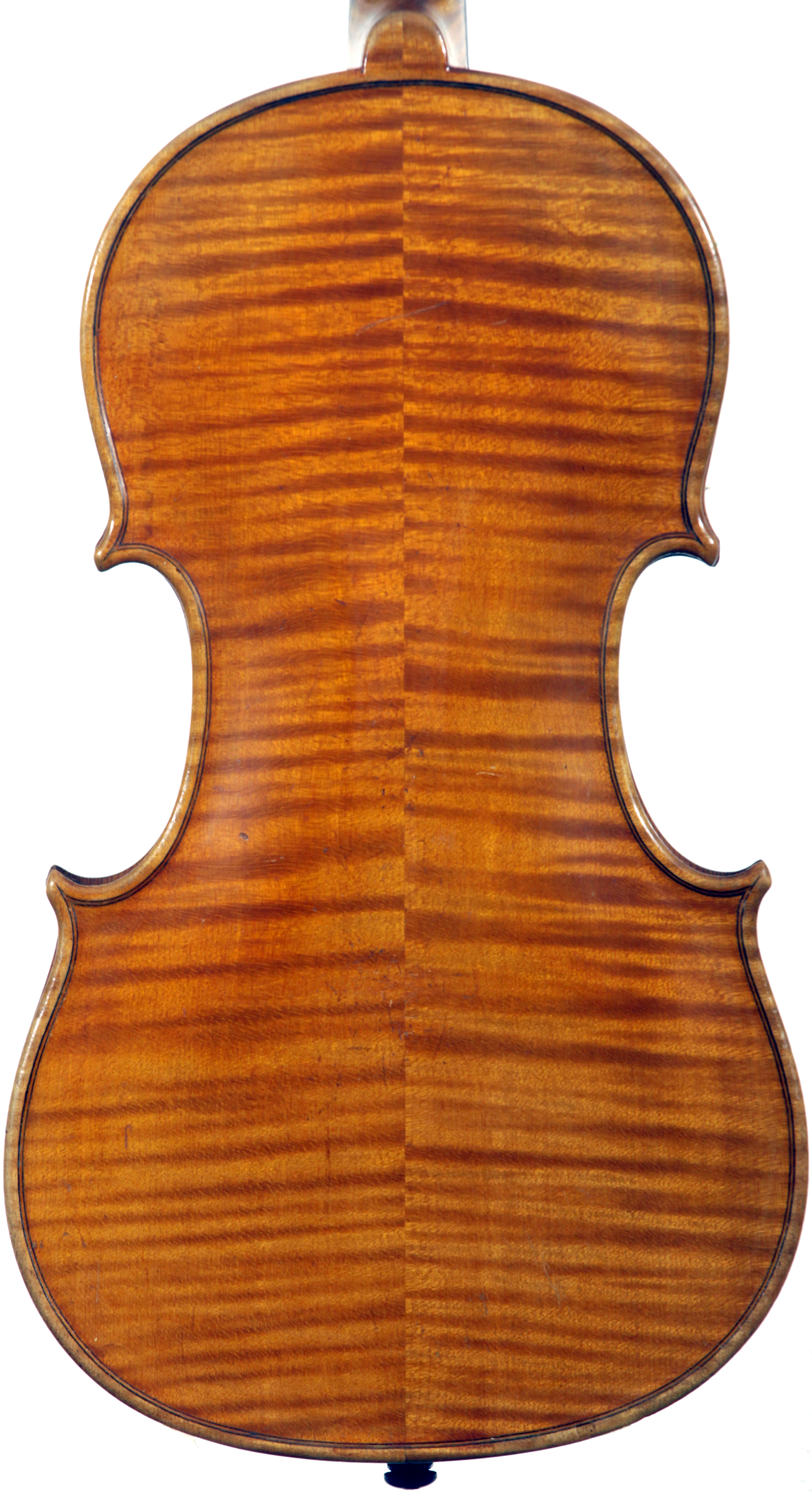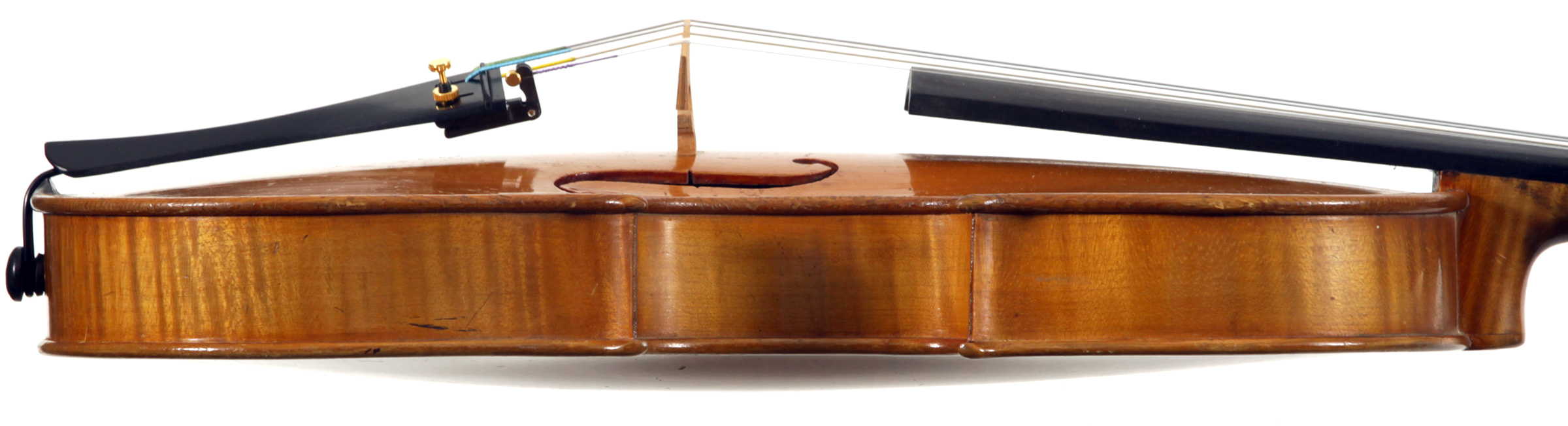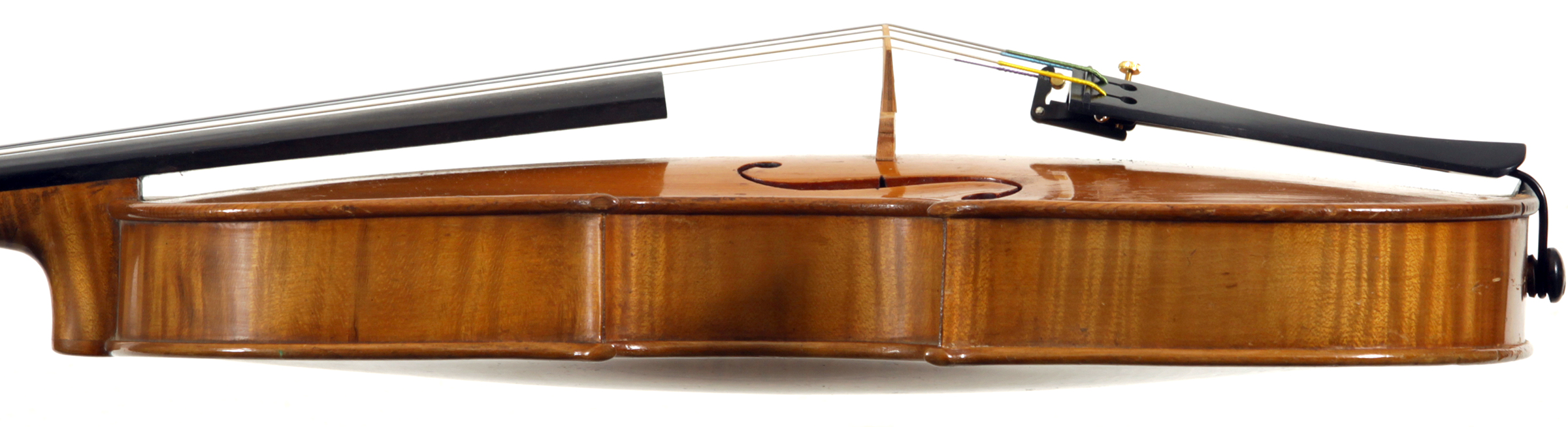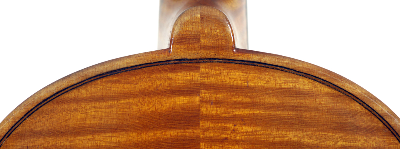 The two-piece back, ribs, neck and scroll are of well-figured maple with a medium straight curl. The top is of excellent tone spruce. Purfling and particularly the mitres show refinement and attention to detail. The scroll is nicely finished and balanced and the lower palettes in the Fs are nicely fluted. The golden spirit varnish is very transparent, beautifully complimenting the wood. All of the above set this instrument apart as a serious violin of serious intent.