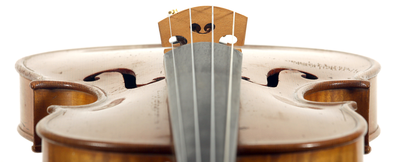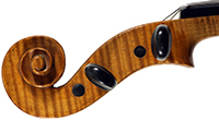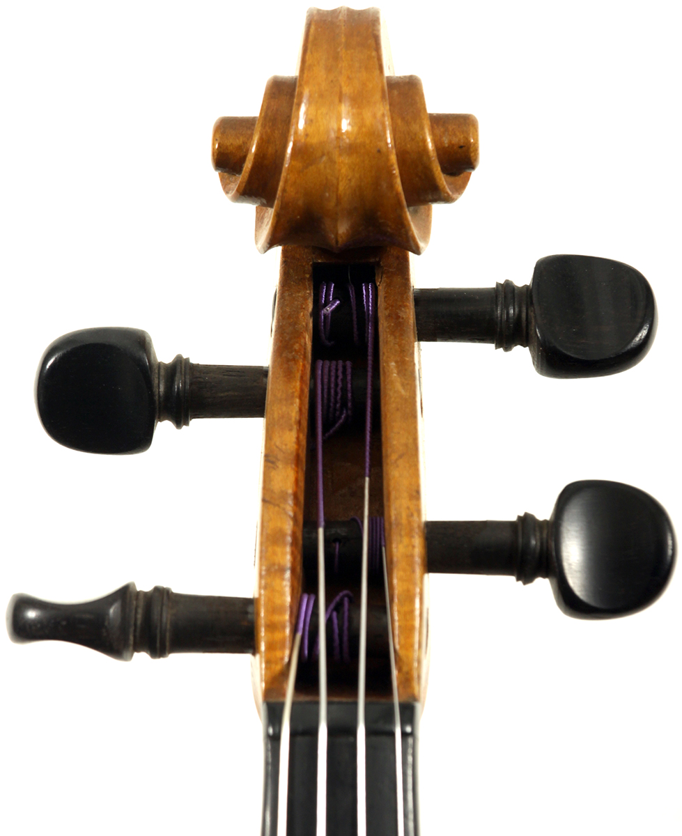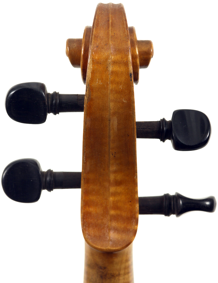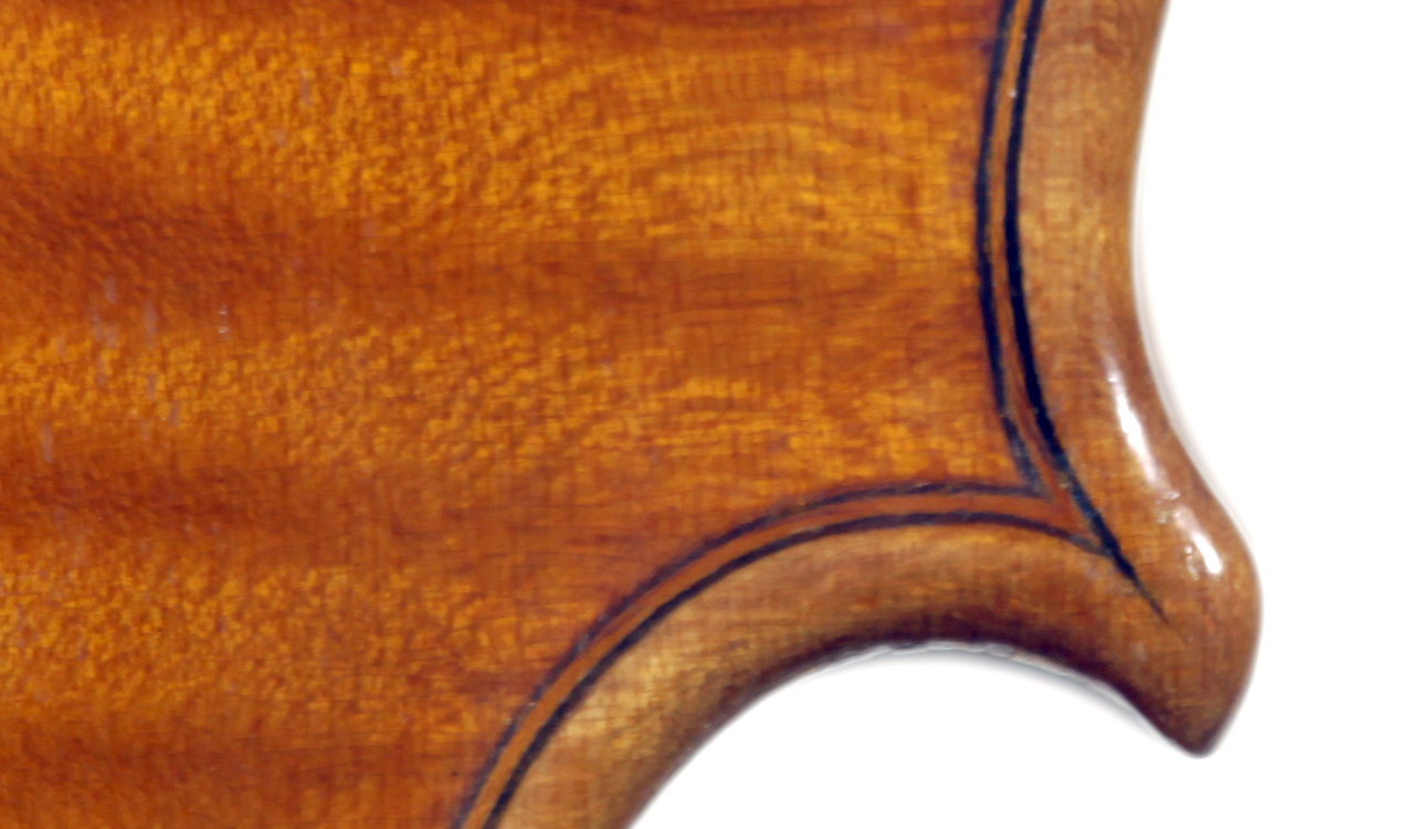 The two-piece back, ribs, neck and scroll are of well-figured maple with a medium straight curl. The top is of excellent tone spruce. Purfling and particularly the mitres show refinement and attention to detail. The scroll is nicely finished and balanced and the lower palettes in the Fs are nicely fluted. The golden spirit varnish is very transparent, beautifully complimenting the wood. All of the above set this instrument apart as a serious violin of serious intent.