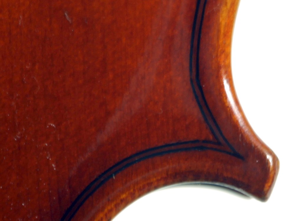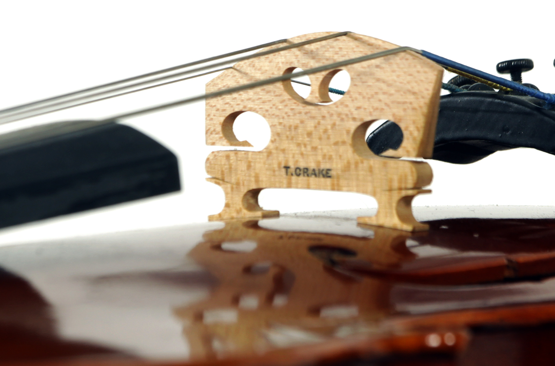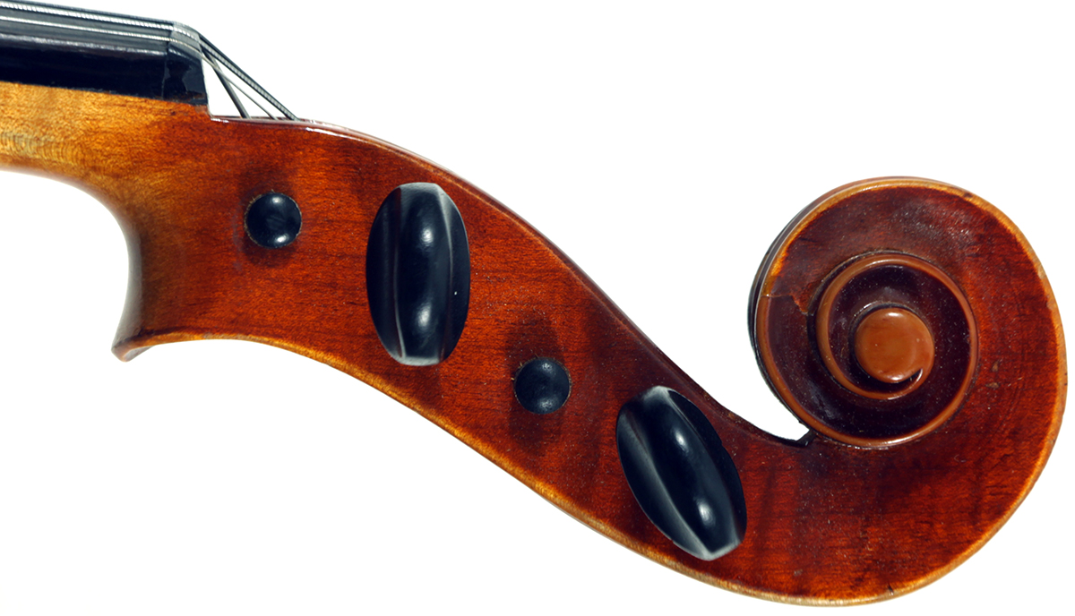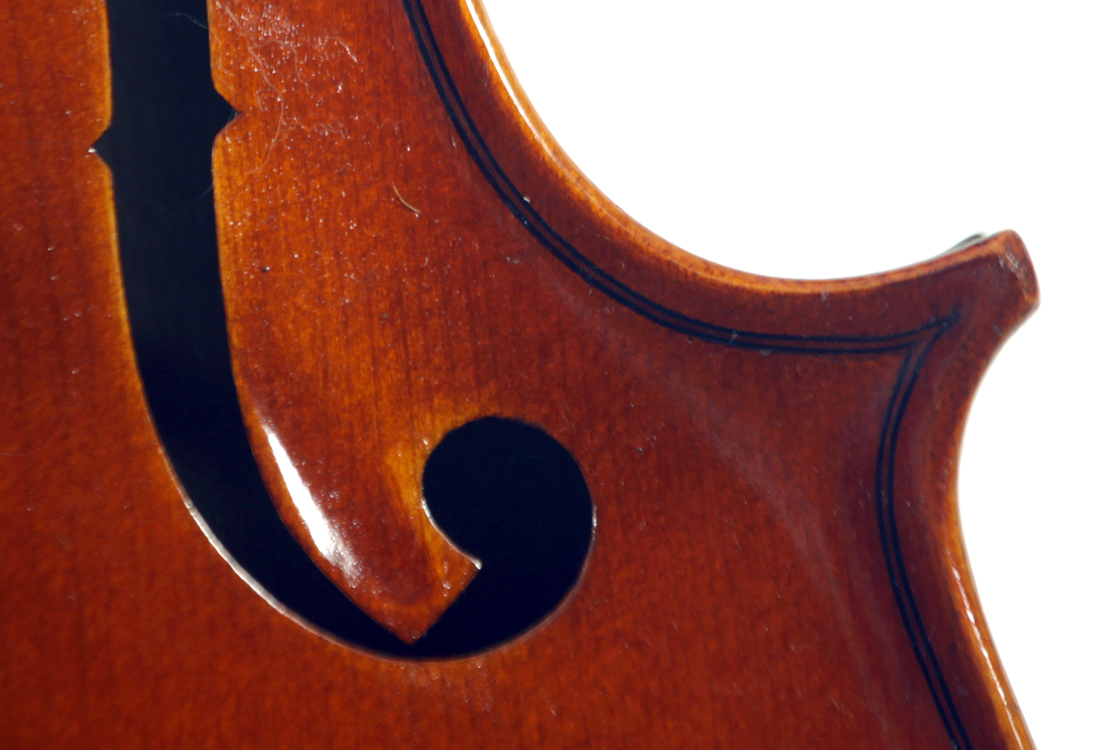 The two-piece back, ribs, neck and scroll is of mildly flamed maple. The front is of good tone spruce and all workmanship is refined and accurate. Interestingly the bridge was made by Timothy Crake, a London - graduated violin maker who lived in Johannesburg for a number of years before moving to New Zealand where he passed away.