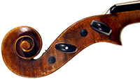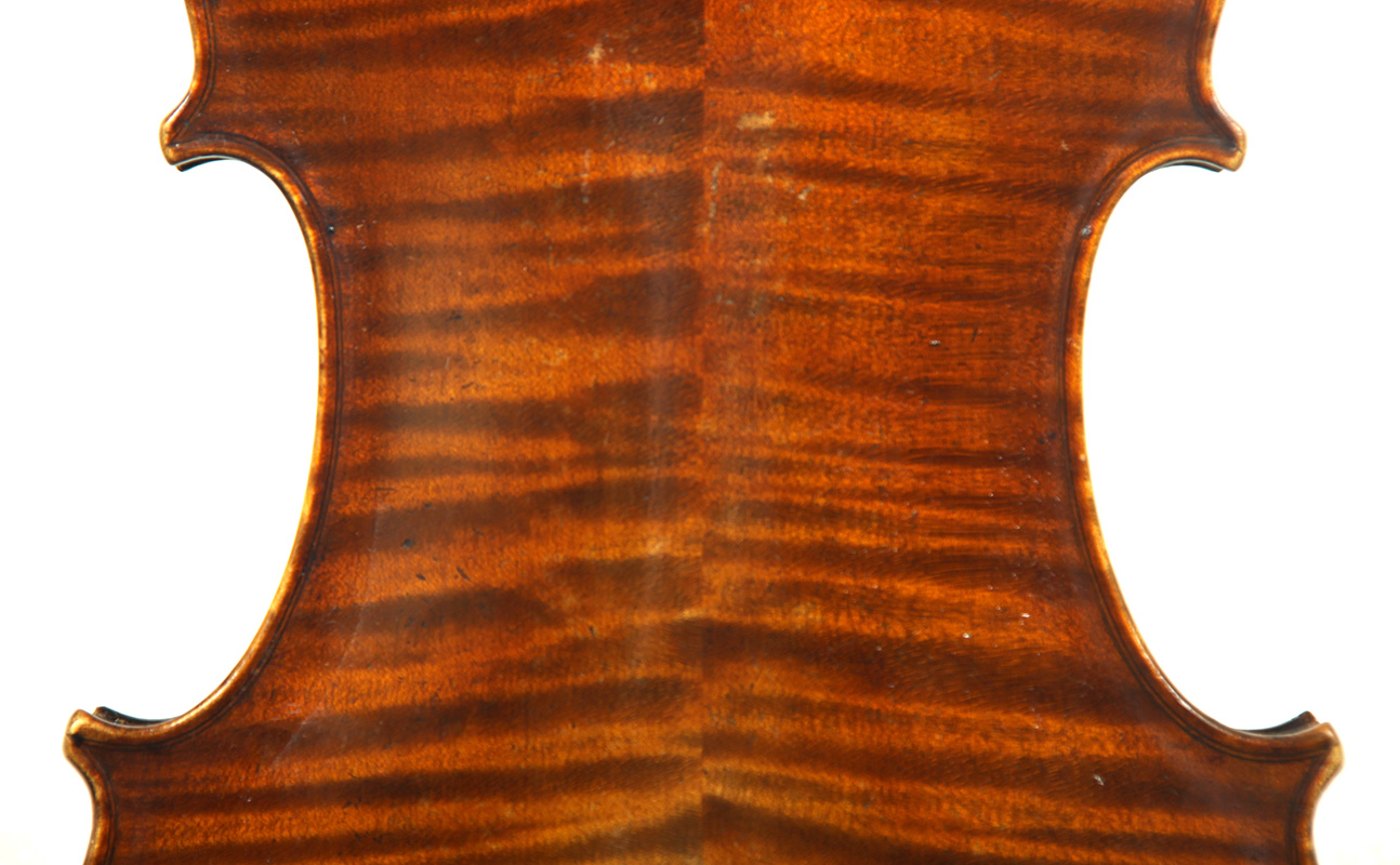 The two piece back, ribs, neck and scroll are of attractive, nicely-flamed maple with a medium to broad curl. The top is of excellent medium grain tone spruce. The varnish appears to be oil based and compliments the materials well. Workmanship throughout is refined and of high quality. The scroll in particular is very well balanced.