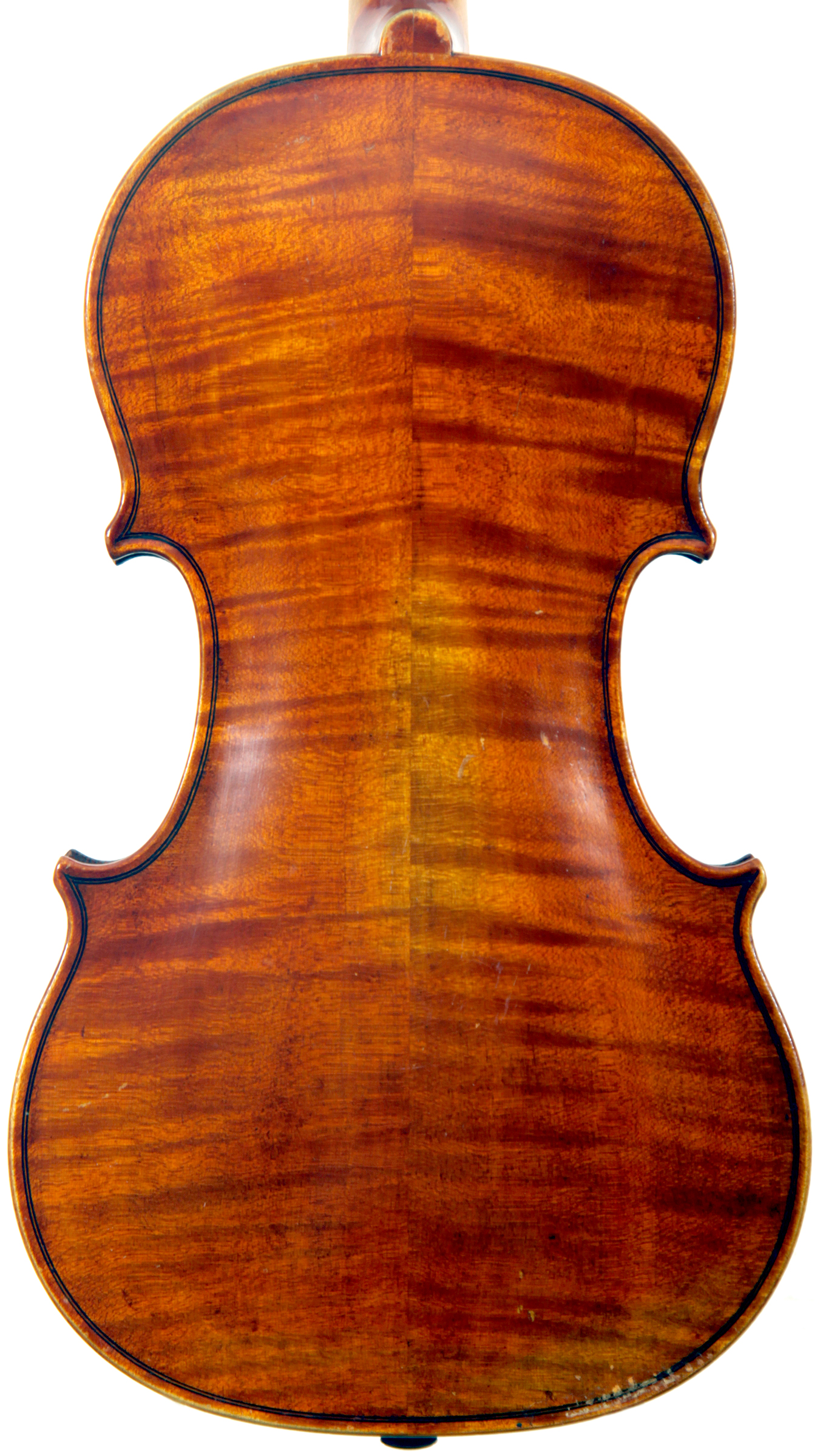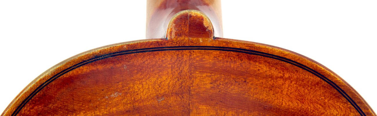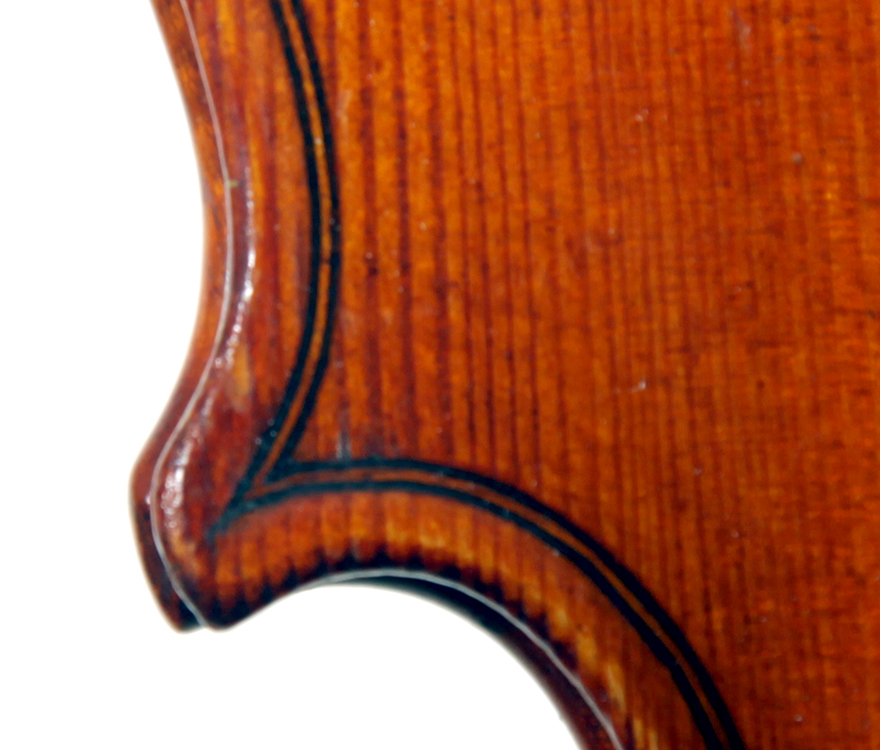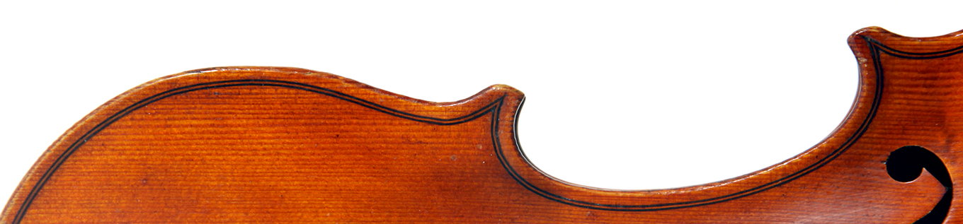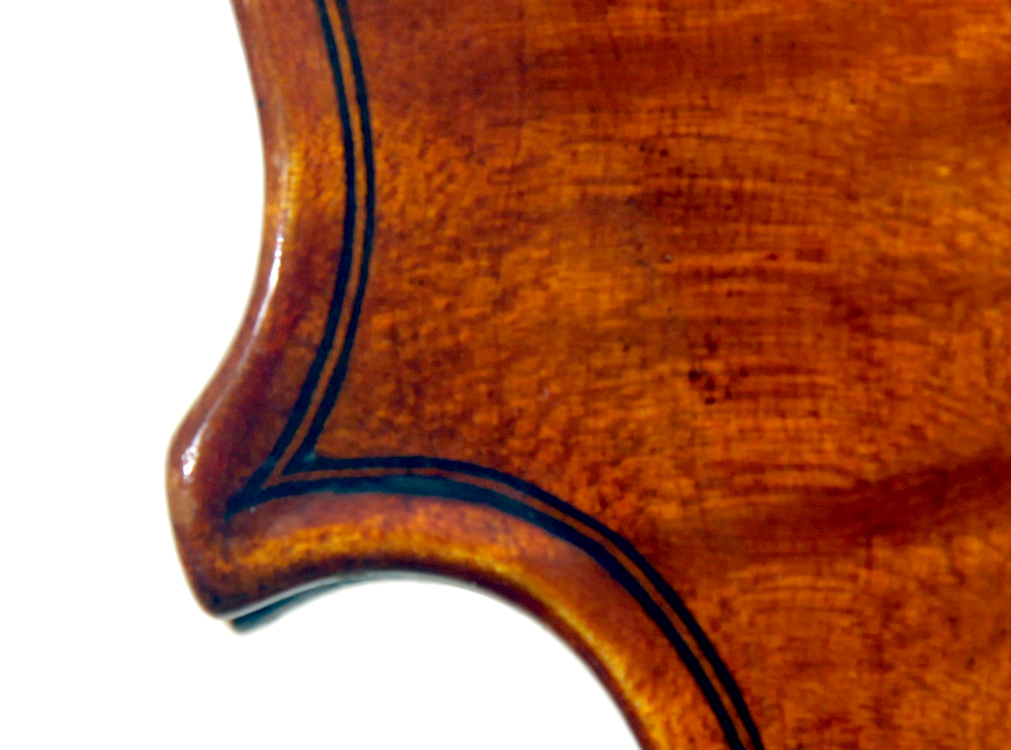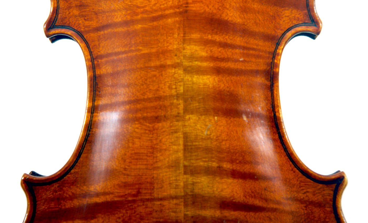 The two-piece back and ribs are of very attractive nicely figured maple with a distinct curl. The neck and scroll are of more plain wood. The varnish is an attractive amber and workmanship throughout is refined and accurate, conforming to the requirements of high-end lutherie.