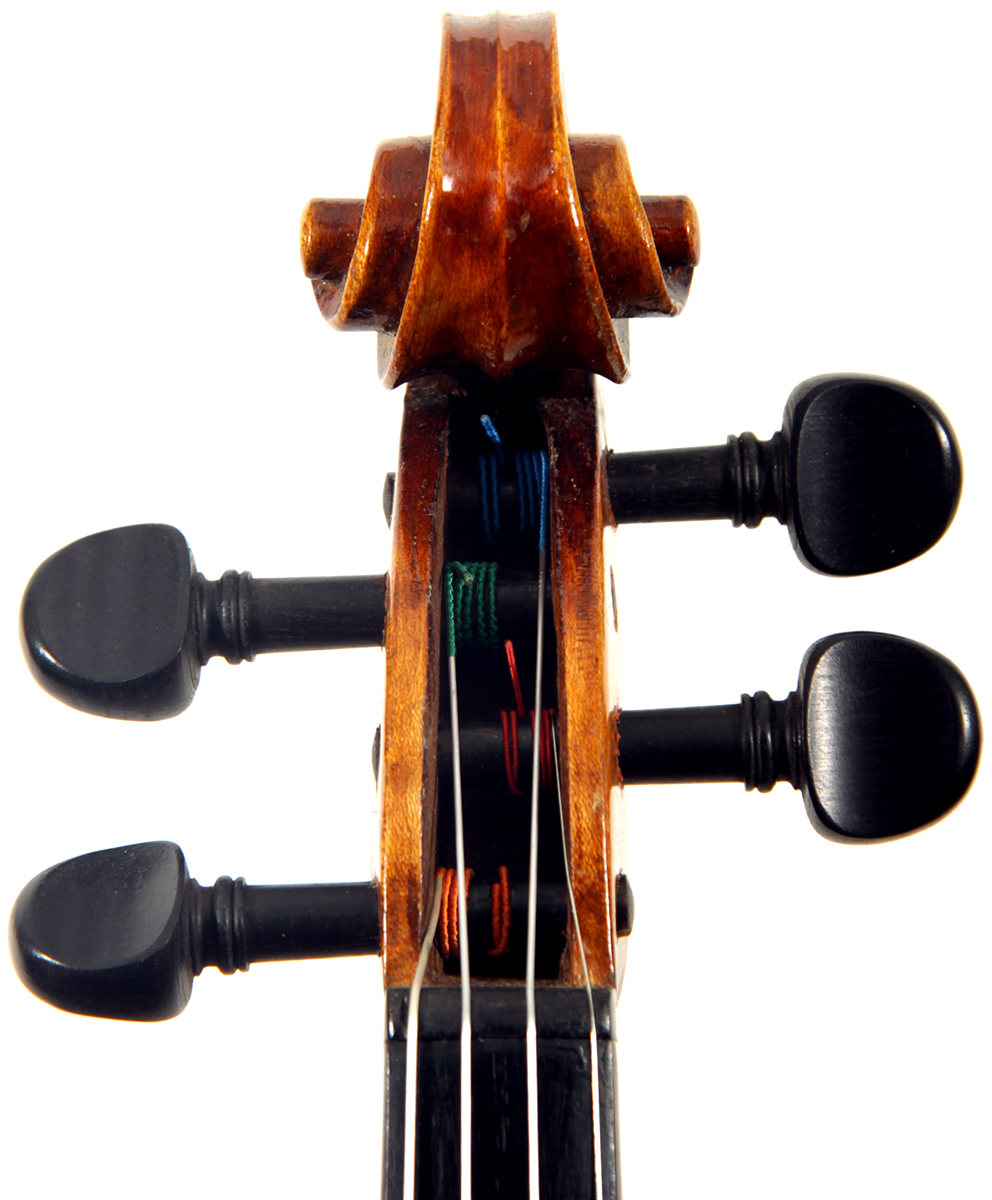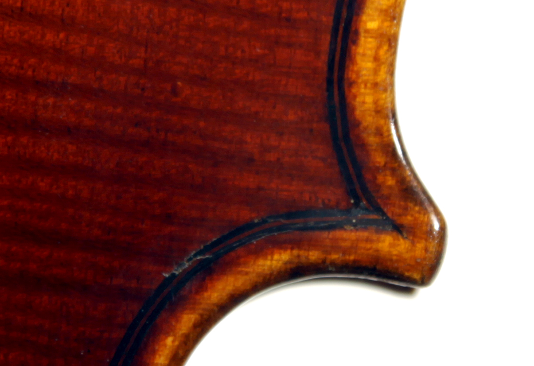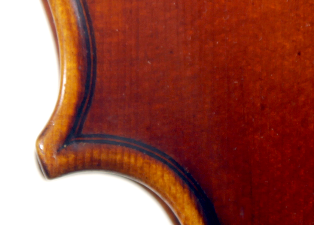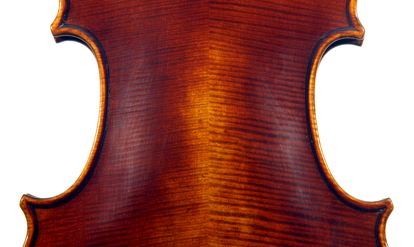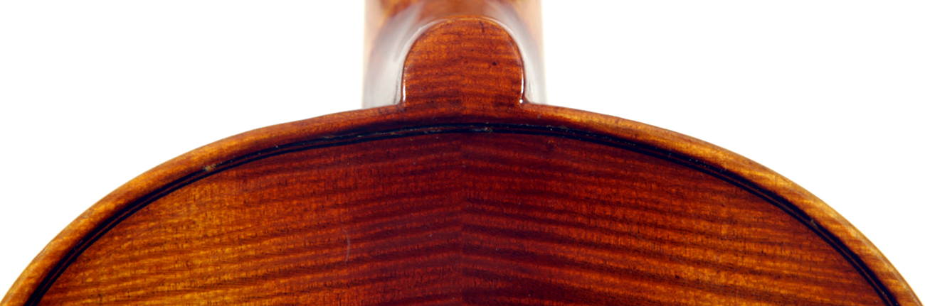 The two-piece back and ribs are of nicely figured maple with a distinct very narrow and straight curl. This is repeated in the neck and scroll. The varnish is an attractive reddish brown, graded to the yellow ground. Workmanship throughout is refined and accurate.