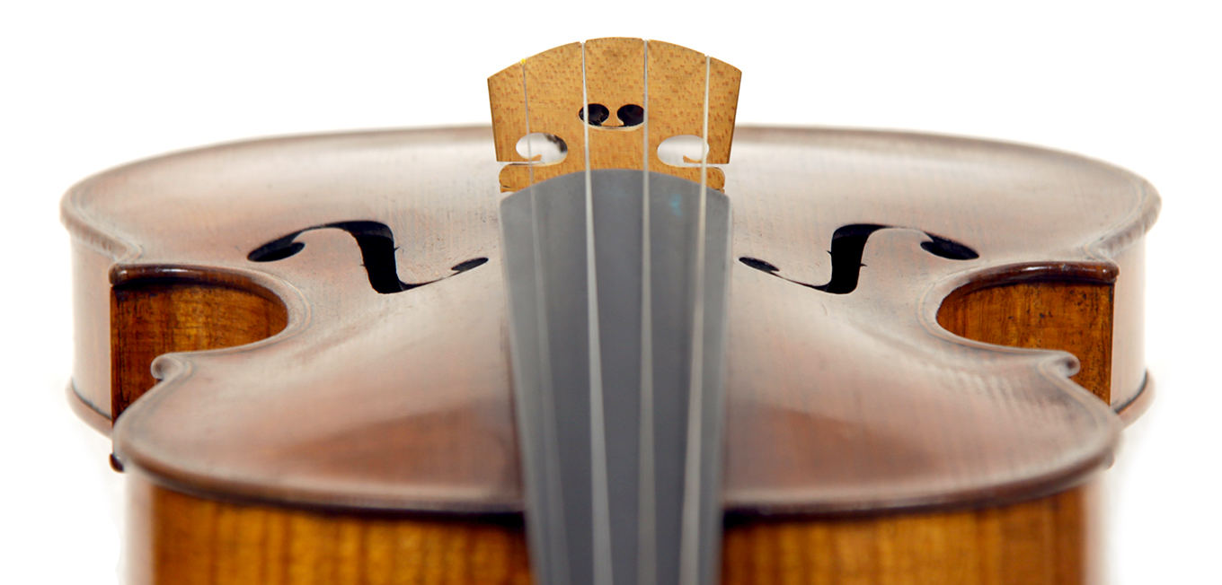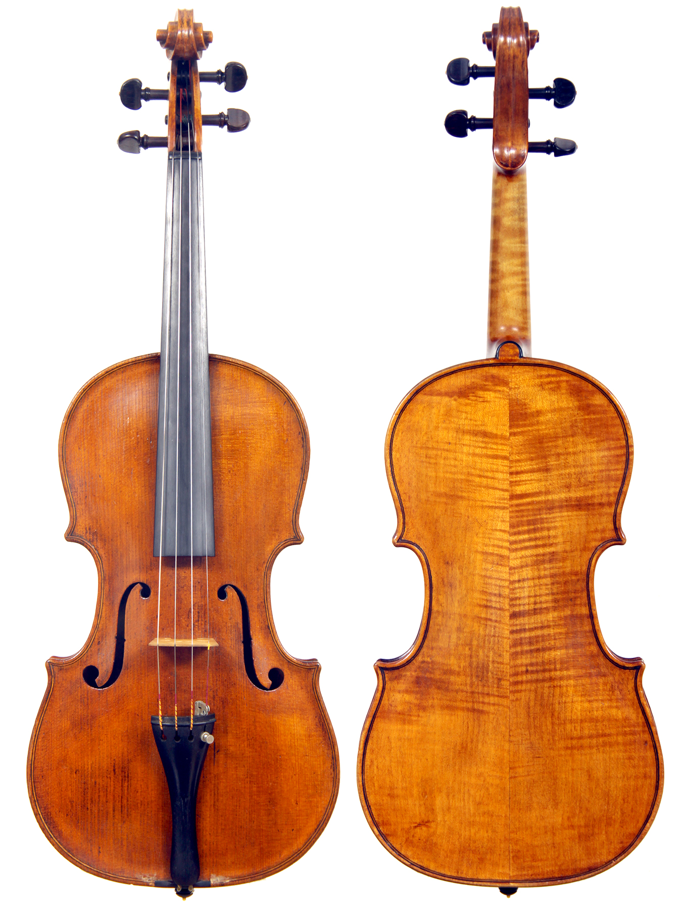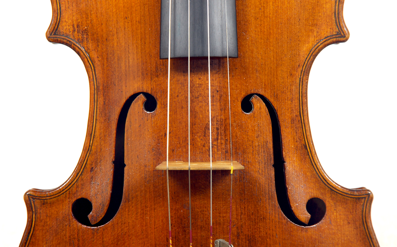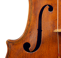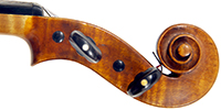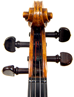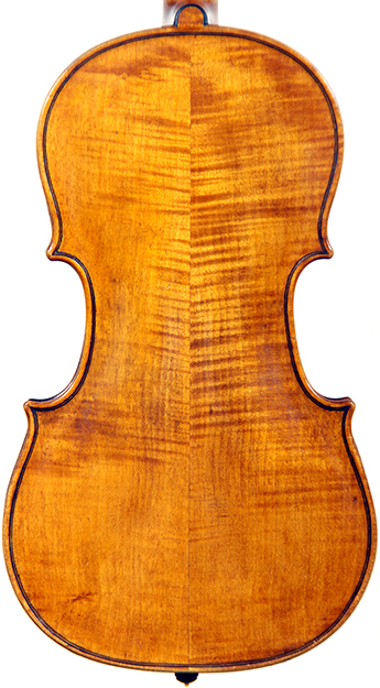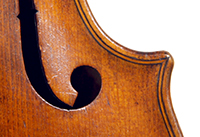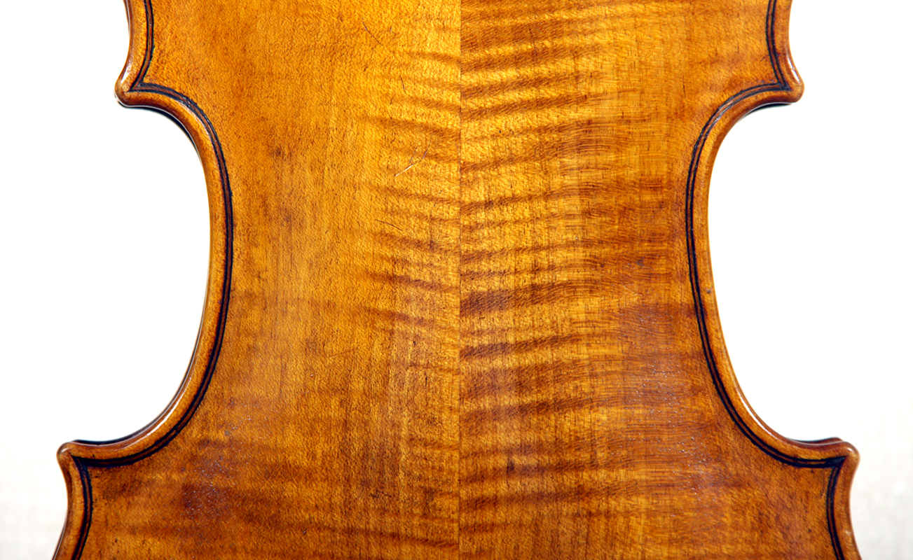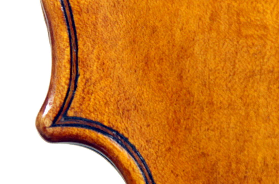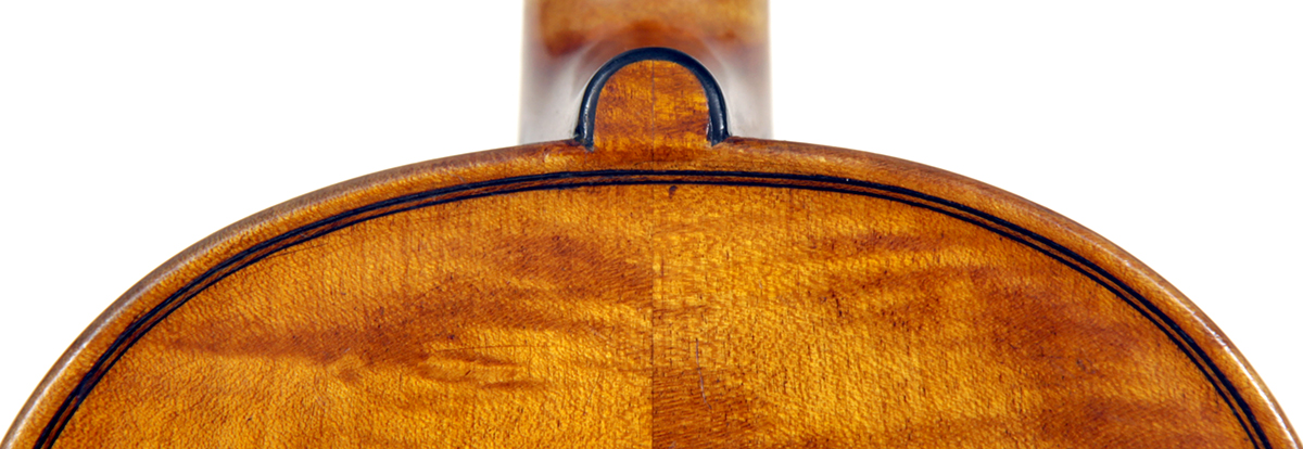 This violin throughout shows a steady hand with attention to detail in all respects. The choice of materials is good; the two-piece back, ribs and scroll are of good mildly flamed maple with a narrow to medium curl. The neck appears to be later. The top is of good tone spruce and the purfling is tidy throughout. The golden-brown varnish is appealing to the eye.