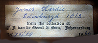 The important Dutch authority, J. J. van de Geest, relabelled this violin to indicate that it was part of his collection and was made by James Hardy in Edinburgh in 1863. This serves as adequate certification of origin since Van de Geest was a master craftsman who had been the workshop overseer for George Hart & Son in London for 18 years until 1938. He was internationally respected as authority until his death in 1974.