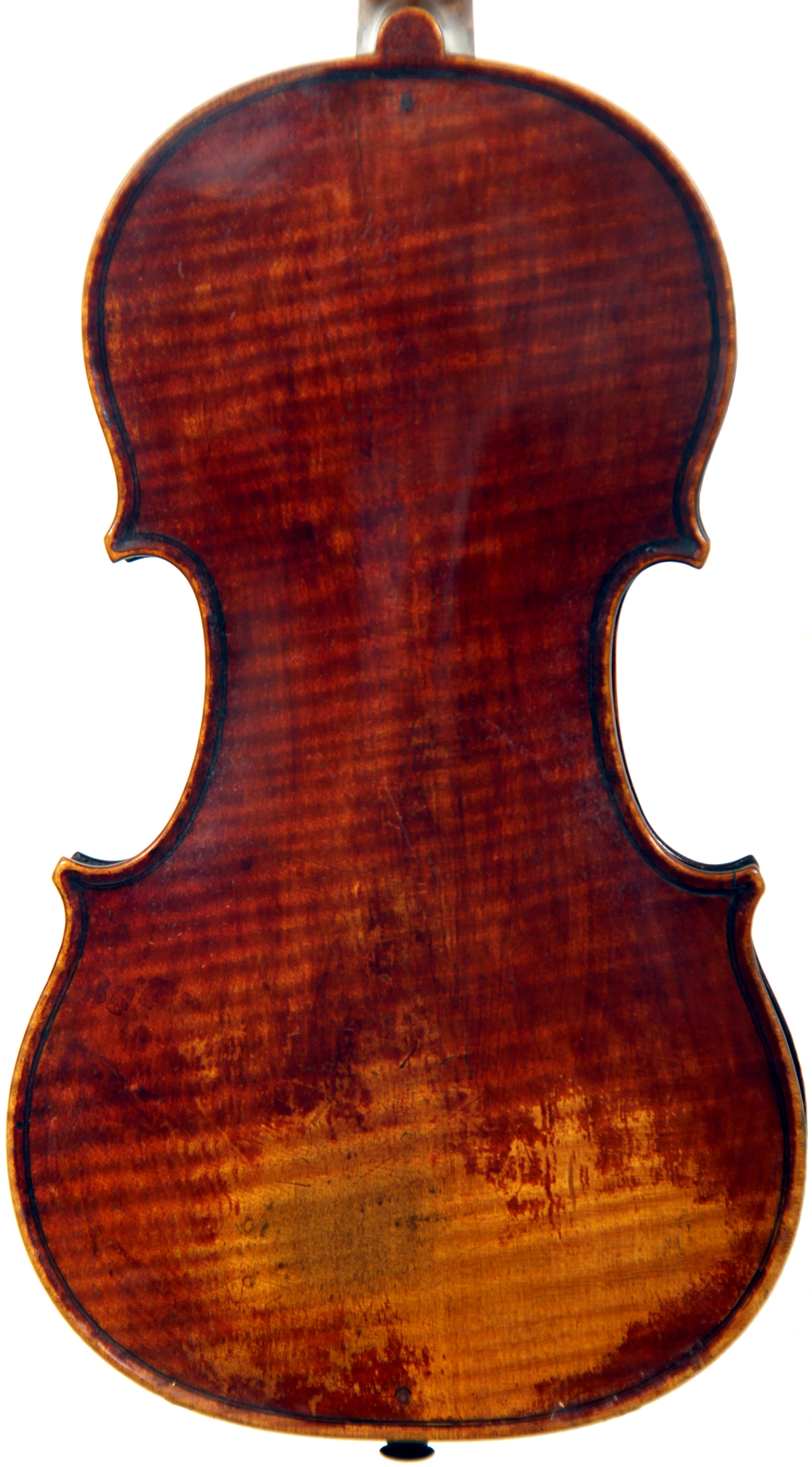 The beautiful wine-red varnish is untouched, though slightly worn in the usual places. The one-piece back and ribs are of attractive mildly flamed maple with a medium curl repeated in the neck and scroll. The tone spruce top is of very fine grain. Workmanship throughout is excellent.