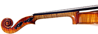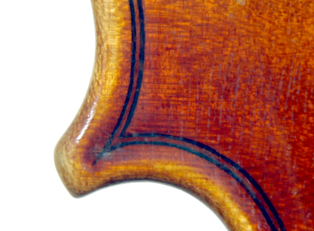 The attractive one-piece back, ribs, neck and scroll are made from the same piece of well-flamed maple with a distinct medium curl. The top is of superb tone-spruce. Workmanship throughout is refined and conforms to a very high standard. The scroll is particularly attractive - elegant and very well balanced. The golden amber varnish is slightly shaded and compliments the materials well.