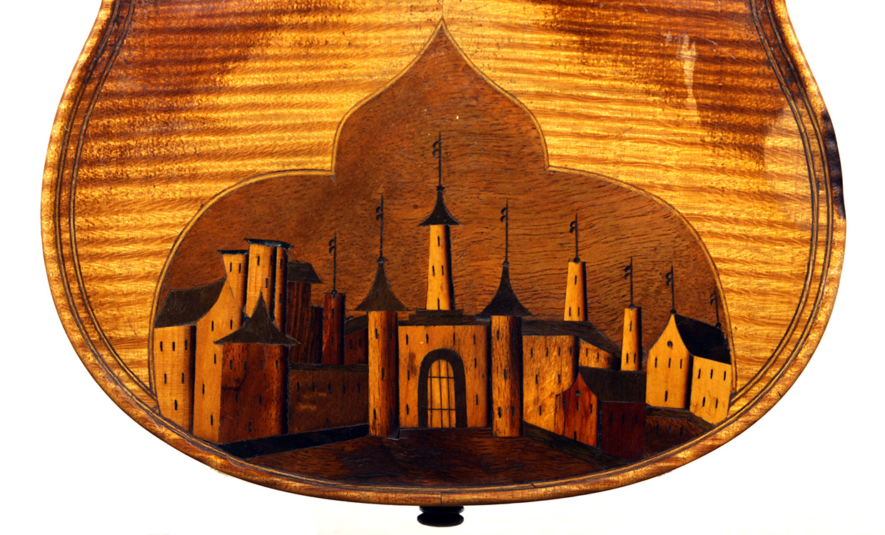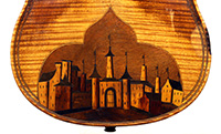 This instrument shows a fine selection of materials - the two-piece back and ribs are of well-flamed maple with a distinct curl. The back has the inlaid city scene. The top is of medium grain tone spruce. All the purfling is doubled. The neck and scroll are less flamed.