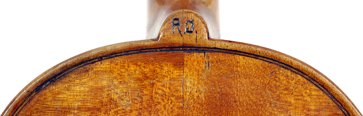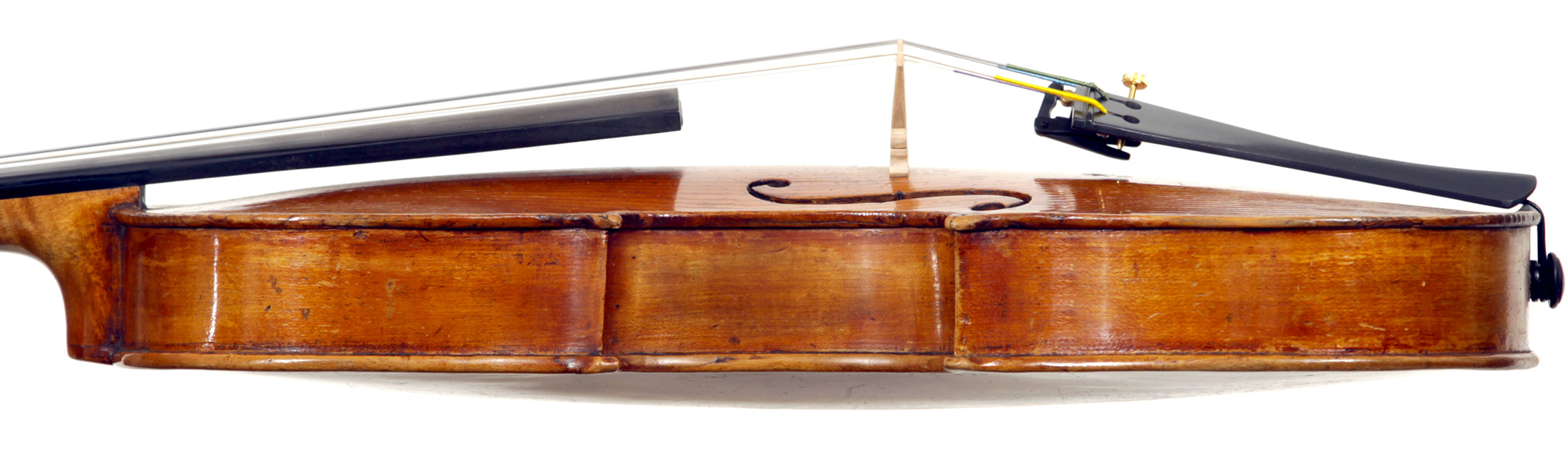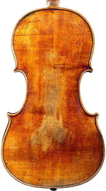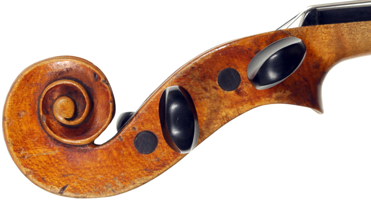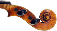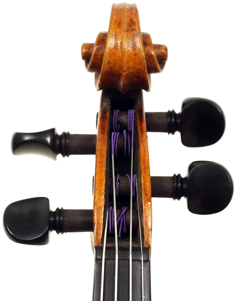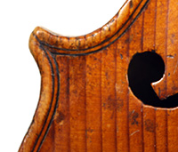 Much about this instrument intrigues: according to the foremost dendrochronologist, Peter Ratcliff, it was made after 1850, yet it has a perfectly executed neck graft (one of the best I've seen). This violin bears signs of much use, but is virtually in perfect structural condition. Furthermore, the central strip in the purfling appears to be of baleen (whalebone).