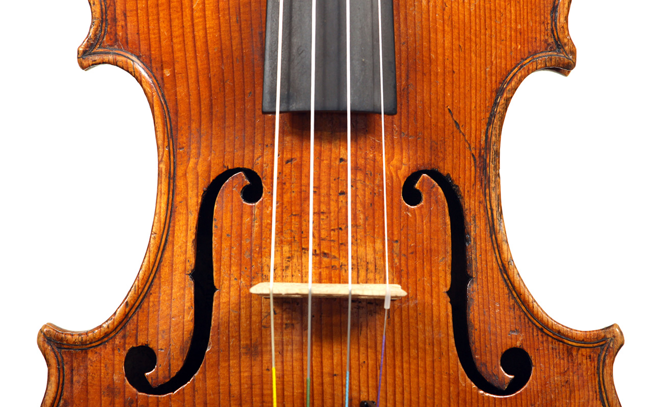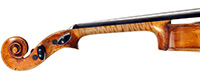 The light golden varnish on this violin, with a tinge of amber, is truly appealing. One is struck by the top, which is of unusually broadly grained tone spruce, crafted from a single piece of wood, with wide grain in the bass flank narrowing to the treble side. Furthermore, the back, ribs and scroll are of very plain maple, evidently slab-cut.