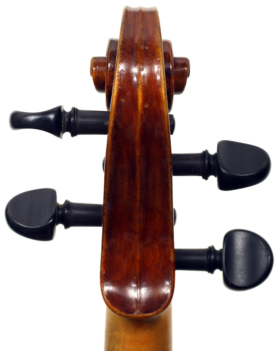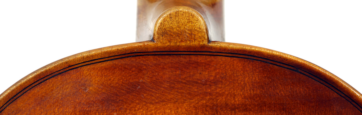 The one piece back, ribs, neck and scroll are of mildly flamed maple. The top is of excellent medium grain tone spruce. The oil-based varnish is a beautiful deep amber over a yellow ground. Purfling and cornerwork are impeccable.