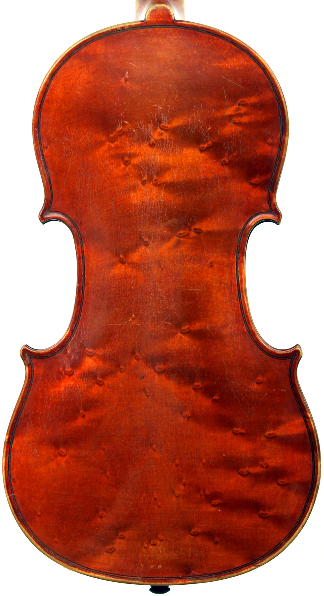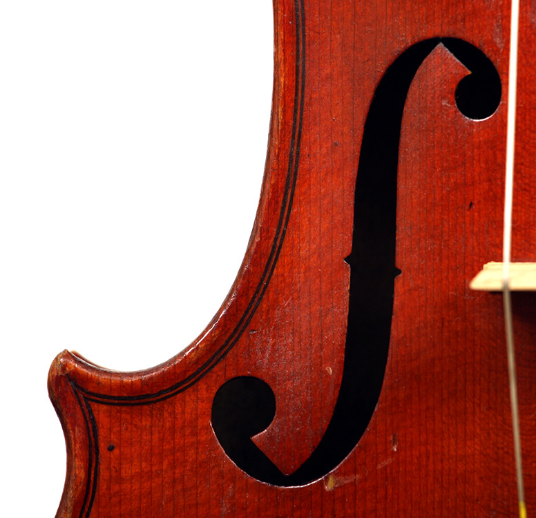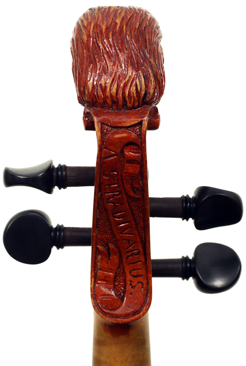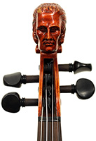 The most striking feature in this instrument is that it has a carved head, instead of a scroll, ostensibly as a tribute to Stradivari. Furthermore, the back and ribs are of attractive bird's eye maple with very distinct motives in the wood, real eye catcher. The top is of very good tone spruce with a very even medium grain throughout. The red-brown varnish is very translucent and compliments the materials well. Workmanship throughout is refined and steady, conforming to high standards.