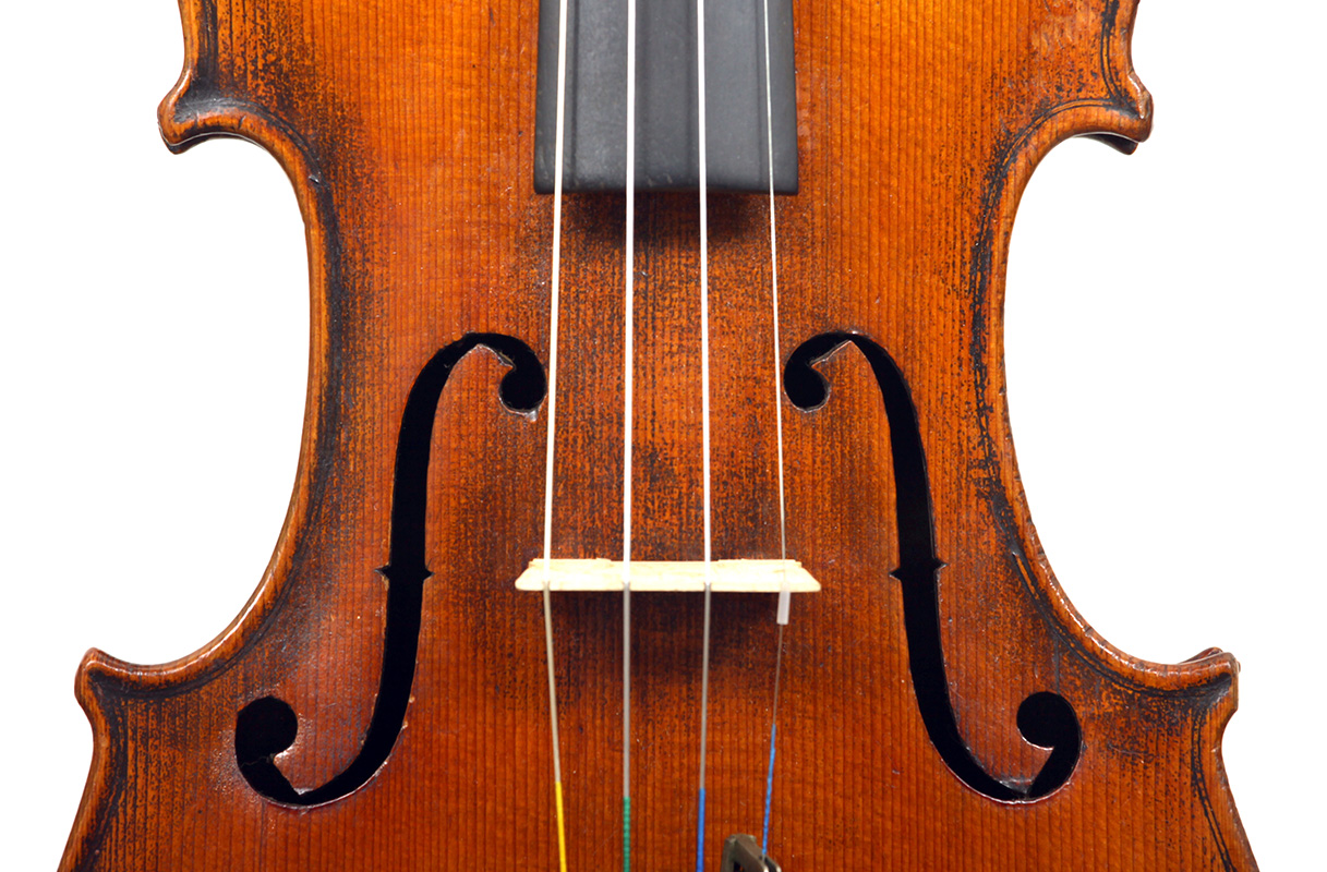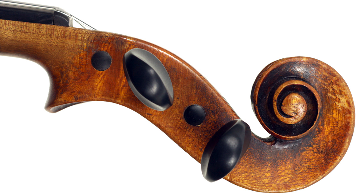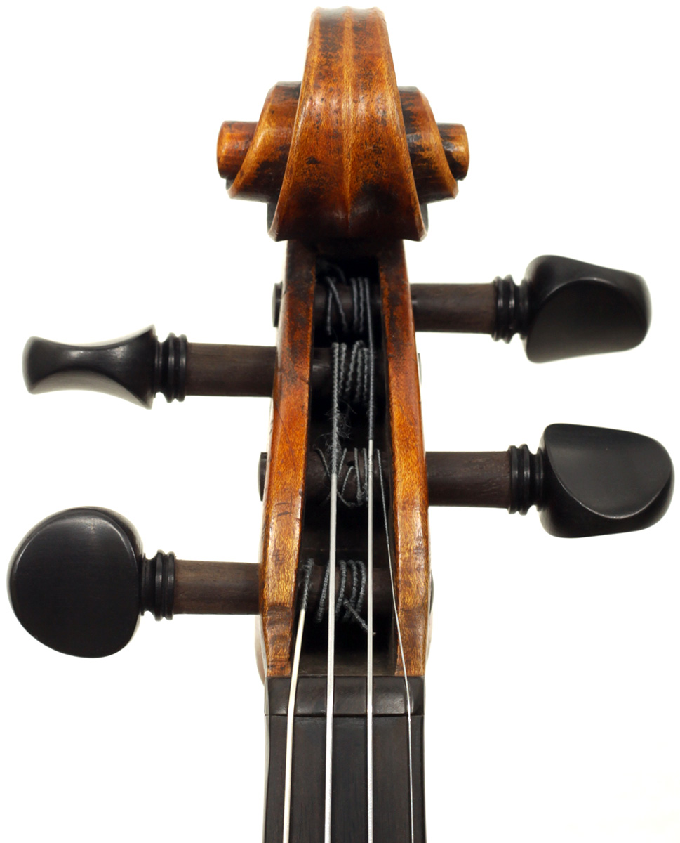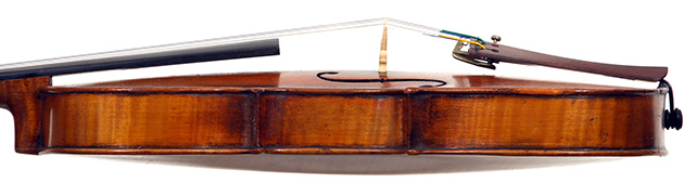 The two piece back, ribs, neck and scroll are of mildly flamed maple. The top is of very good tone spruce with an even medium grain. The Fs and scroll appear somewhat perfunctory but the tracing of the purfling and corner work show an experienced and steady hand. This violin is responsive and easy to play. It would be a suitable intermediate upgrade for a talented student wishing to make progress.