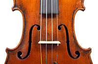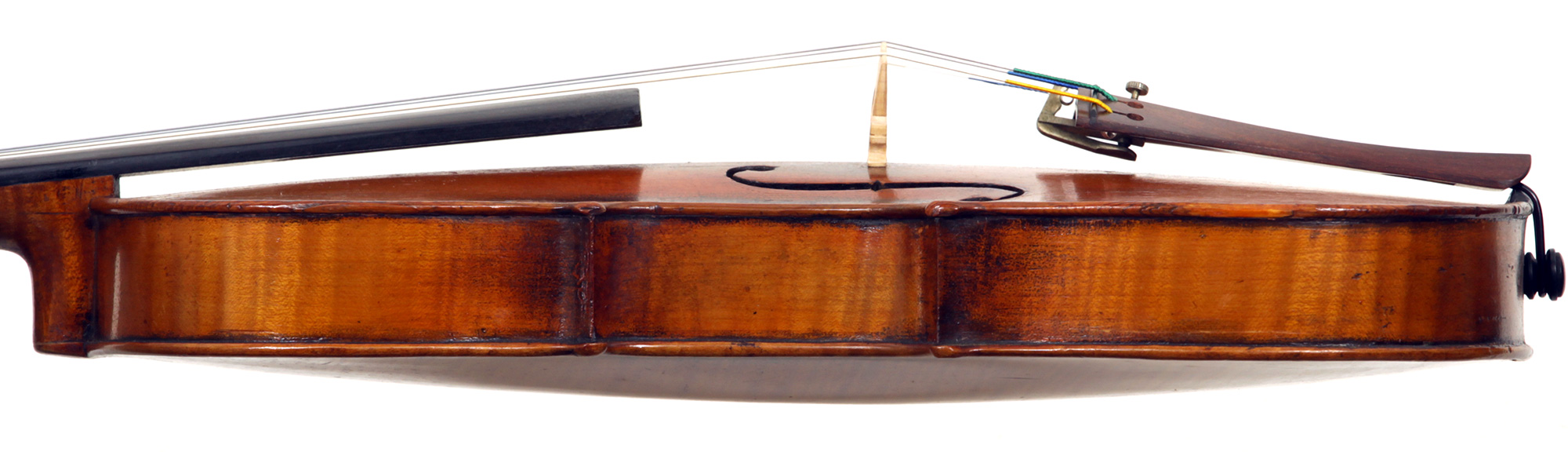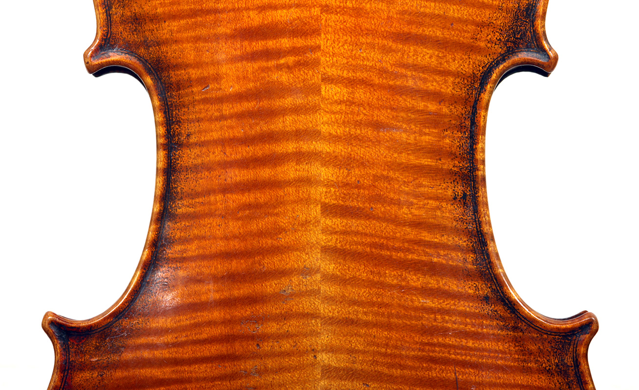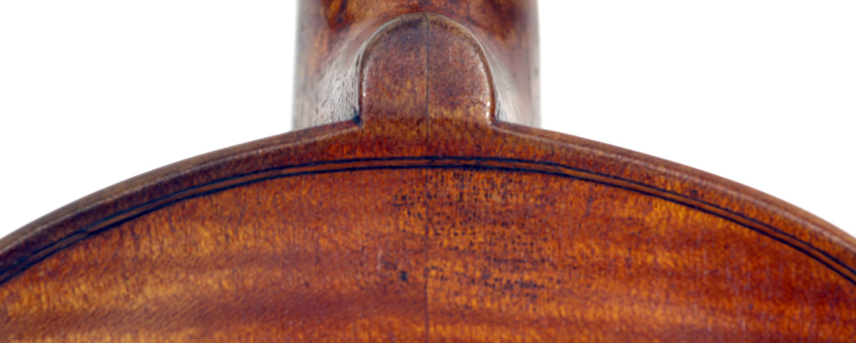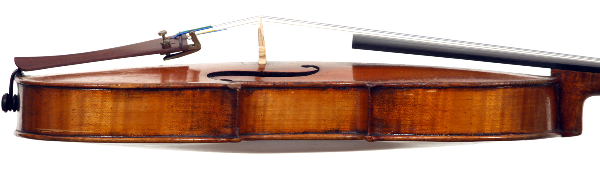 The two piece back, ribs, neck and scroll are of mildly flamed maple. The top is of very good tone spruce with an even medium grain. The Fs and scroll appear somewhat perfunctory but the tracing of the purfling and corner work show an experienced and steady hand. This violin is responsive and easy to play. It would be a suitable intermediate upgrade for a talented student wishing to make progress.
