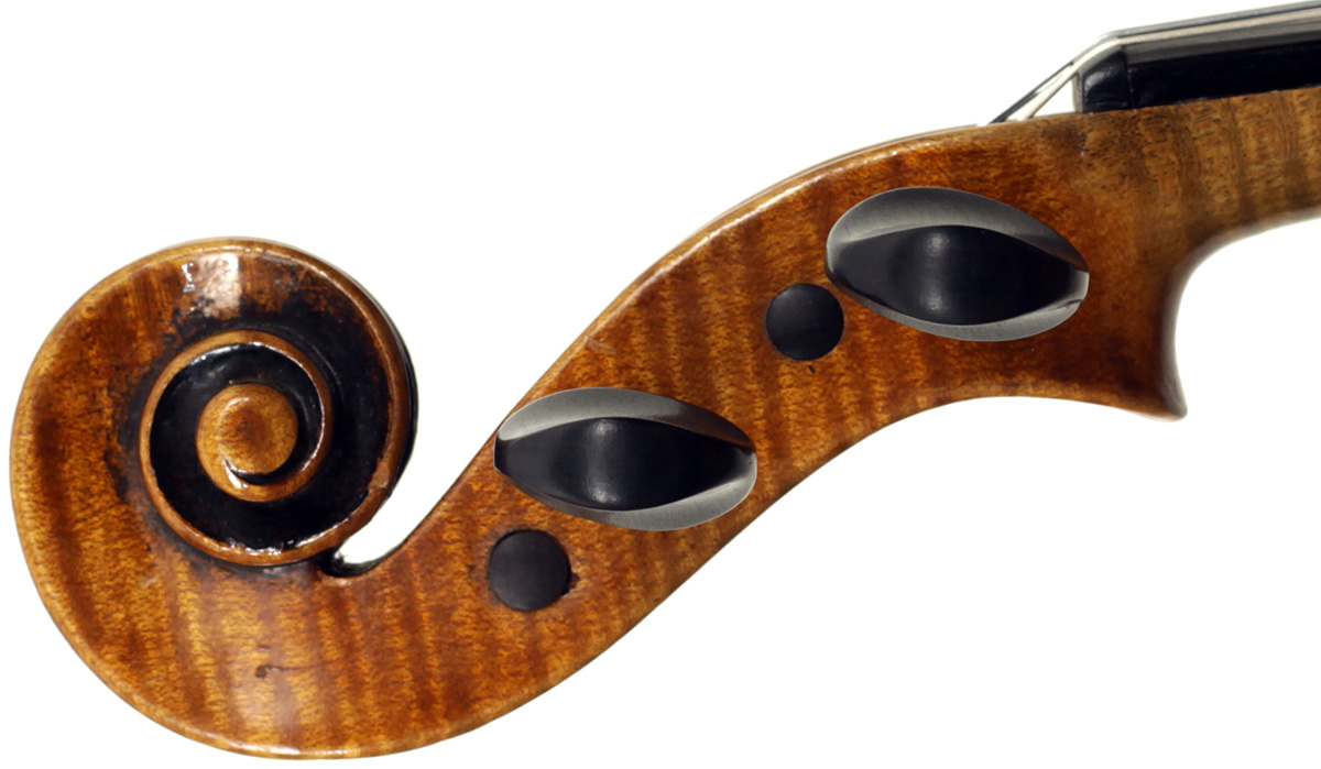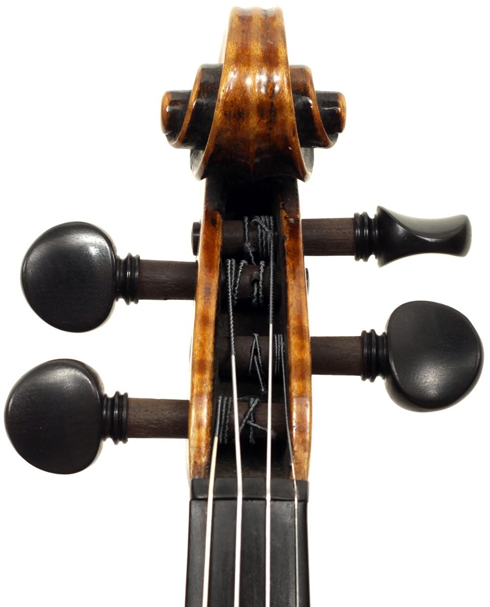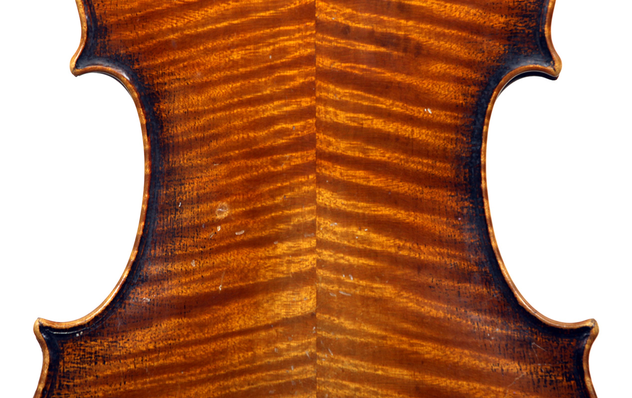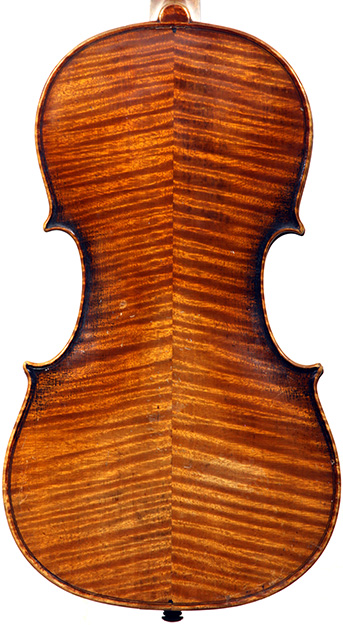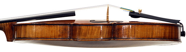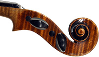 One is struck by a superb selection of materials, notably in the back and ribs. The top is of fine tone spruce with narrow to medium grain. The scroll is refined and balanced and the Fs and purfling show attention to detail.