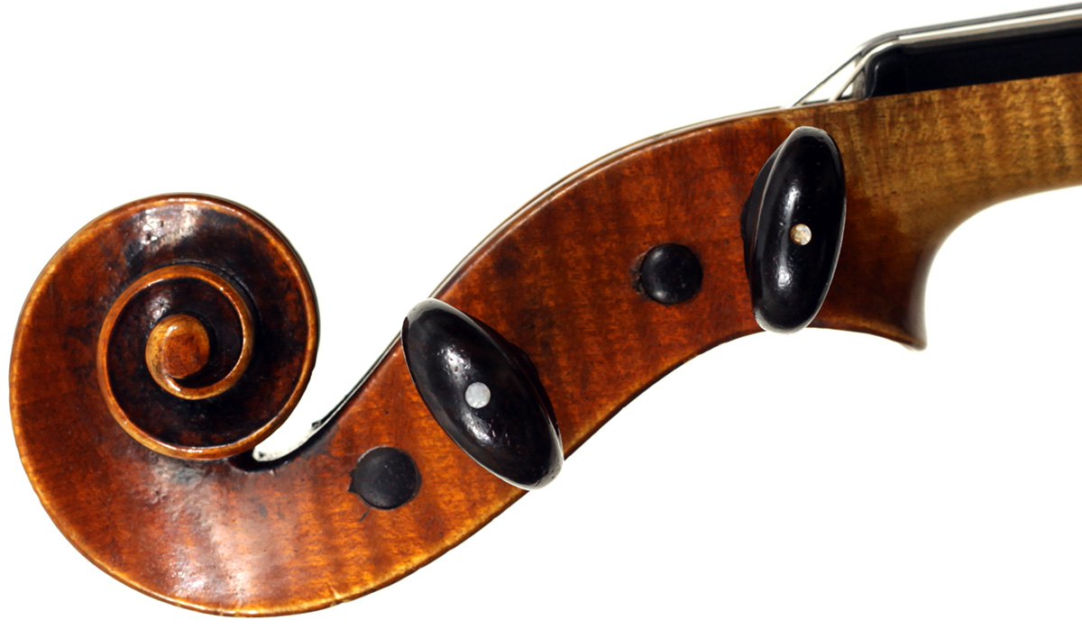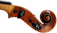 Workmanship in this violin is really good. The one-piece back and the ribs are of nicely flamed maple with a straight medium curl. The neck an scroll use more figured wood and reflect refinement and attention to detail. The scroll is truly elegant and beautifully crafted. The top is of good tone spruce with medium grain at the bass flank narrowing to the treble side.