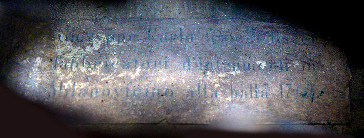 This violin is labelled Giuseppe Carlo Fratelli Fiscer, fabbricatori d'instrumenti in Milano, vicino alla balla, 1710 (see photo). Instruments with this labelling have made it into books by, among others, the authority, William Henley, who refers to the two brothers Giuseppe and Carlo Fiscer as German, having moved to Italy and Italianized their names and worked in Milan. The authority, Karel Jalovec includes them in his work, Italian Violin Makers, as Italian and omits them from his book, German and Austrian Violin Makers. He further indicates that Giuseppe disappears from records around 1764, inferring that he may have died then. The French writer, René Vannes also considers them as being of German origin and working in Milan between 1760 and 1778.