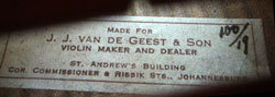 Apart from his own personal output as violinmaker, J. J. van de Geest imported “trade” (commercial instruments aimed at the student and amateur market) from mainly Germany, Holland and Japan. Such instruments were usually of reasonably good quality and he always labelled them as “Made for J J van de Geest”, followed by additional information, such as a serial number, date, address etc. These instruments were NOT made by J. J. van de Geest, but were the output of large trade studios (a euphemism for “factories”). Here are some examples of such labels: