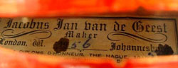 As violinmaker, J J van de Geest’s personal output was of the highest order conforming to the highest standards of the craft. In 1954 he won a gold medal in the Exposition of Liège. The great violinist and teacher, Carl Flesch, played on a Van de Geest and referred to him as “The Wonderful Dutchman”. Van de Geest produced a constant output of instruments by his own hand. These generally are labelled as “Made by Jacobus Jan van de Geest” followed by other details, the year, etc. Here are two examples of the labels of his own work: