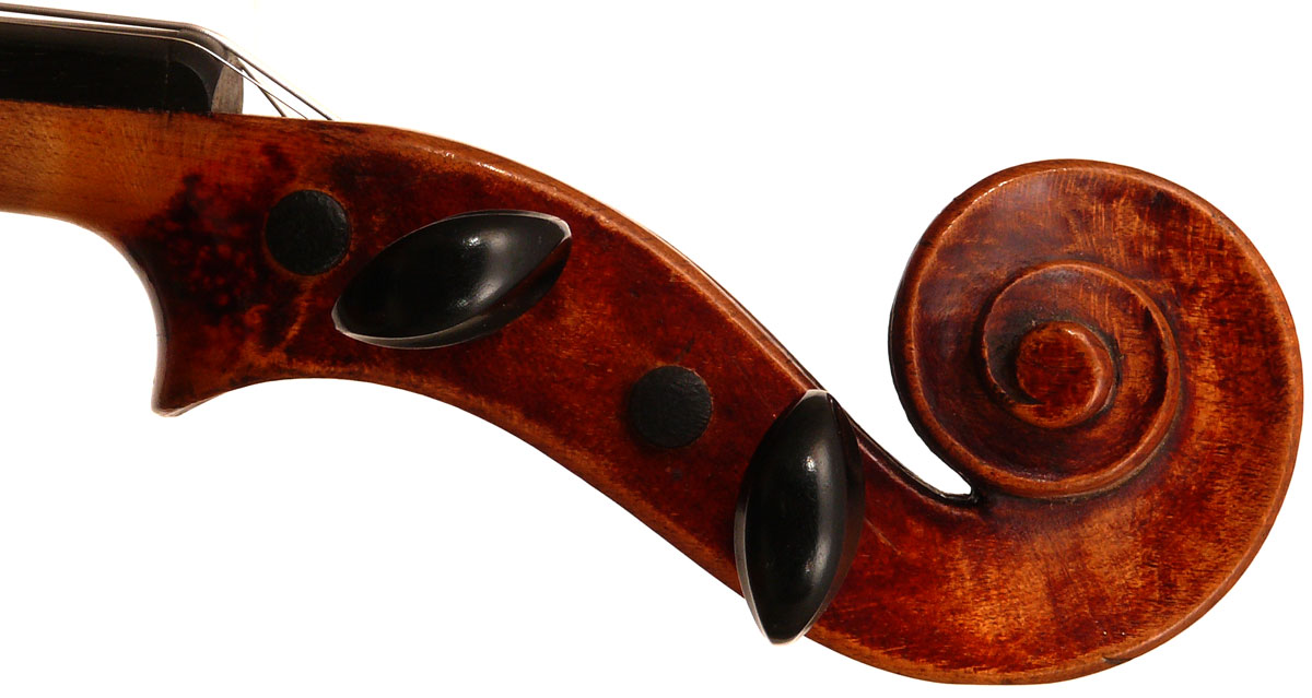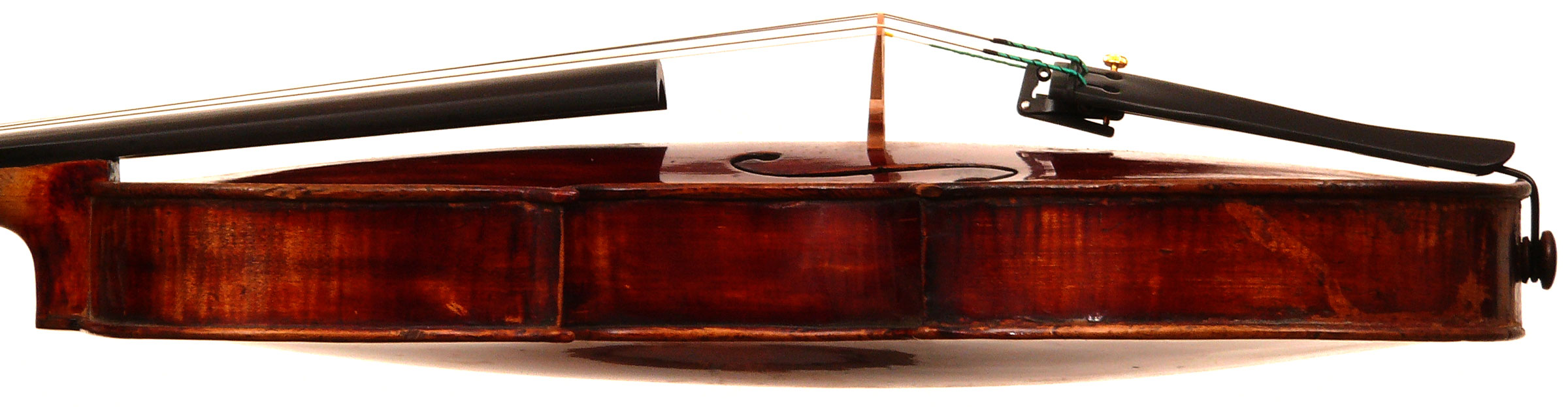 When found, this violin was covered in a dark coat of cheap commercial varnish, and with the back/rib seams around the lower bouts held together with a chemical epoxy. The removal of the epoxy left inevitable superficial damage to the varnish on the ribs in the lower bouts, but with no structural damage. The original varnish on the top, ribs and scroll was exposed after careful removal of the later varnish. Furthermore, an earlier attempt by someone unknown to strip the back has left the original varnish largely compromised and the back scratched, but not structurally damaged.