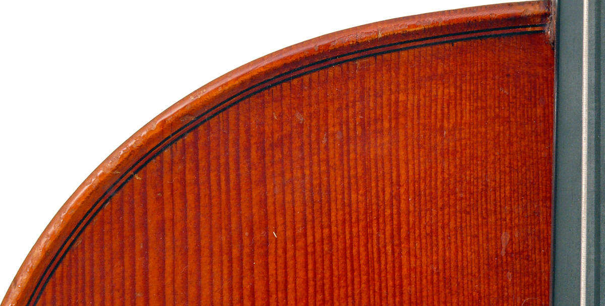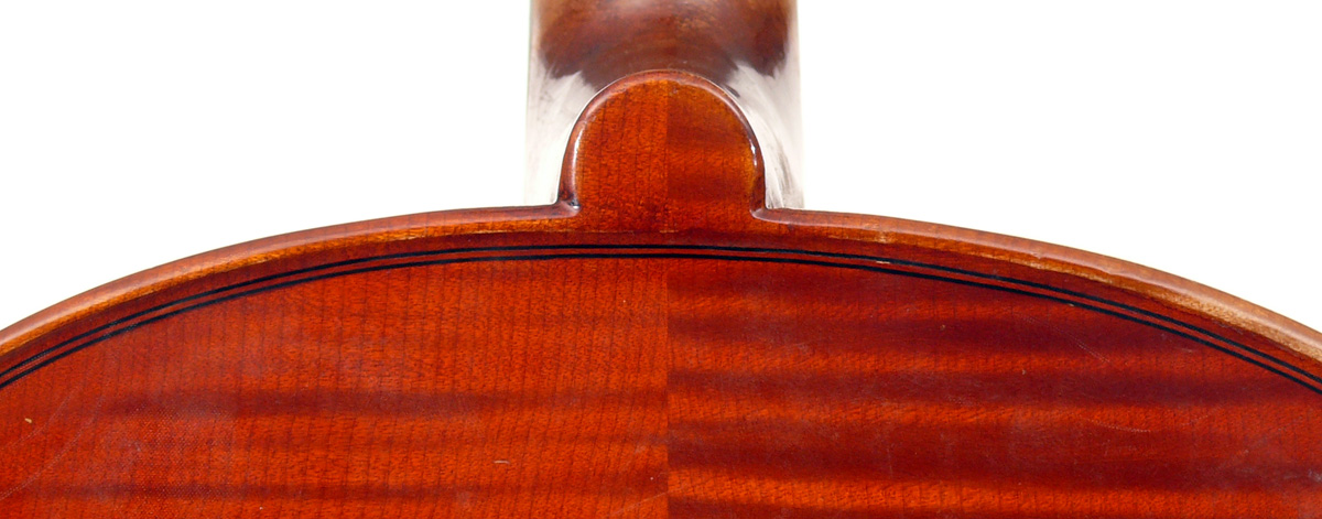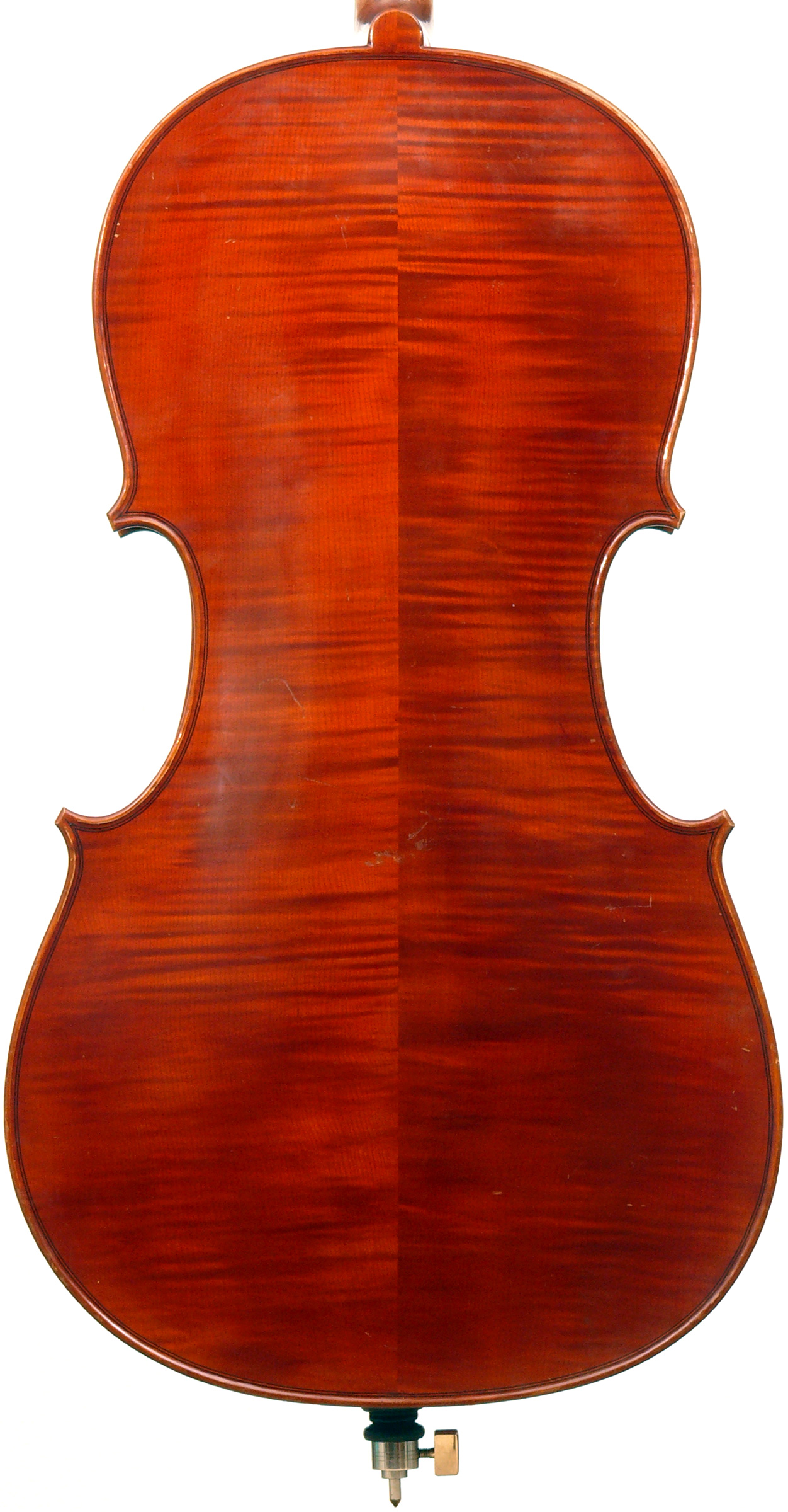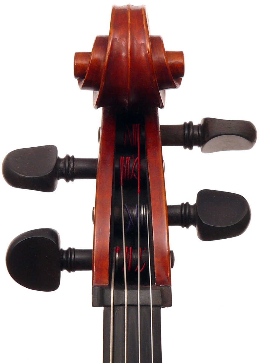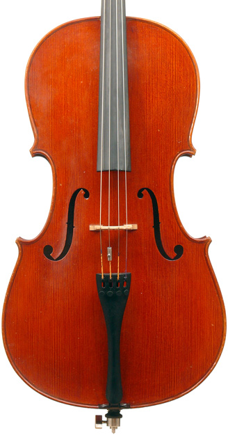 This cello is in excellent condition, completely free from cracks or repairs. The top is of very good tone spruce with wide grain. The two-piece back, ribs, neck and scroll are of mildly figured maple. The varnish is reddish brown and workmanship throughout represents the finest output of the Stentor company.