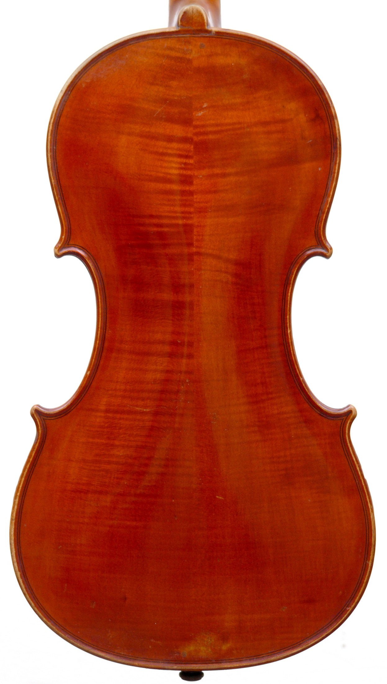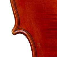 The two-piece back is of mildly flamed maple of narrow curl. The ribs, neck and scroll are of matching material, displaying only very mild flame, to the extent of being almost plain. However, the scroll is a masterpiece of attention, balance and elegance normally associated with Degani's scrolls, and was described by one French authority as 'unmistakably pure Degani'. The top is of tone spruce with narrow grain in the centre, broadening out to the flanks. The f-holes are elegant and balanced. The reddish amber varnish greatly compliments the wood.