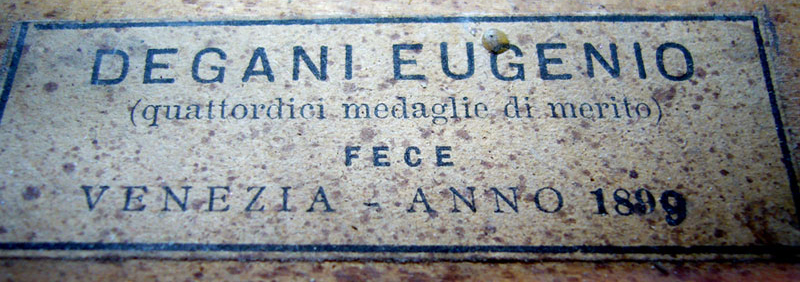 Degani worked in Monagnana, Trieste and eventually settled in Venice, where he produced most of his work. The authority Henley says this of him: "Every curve of the outline splendidly sweeped. Clean and precise approach to corners. Corners and edges distinctively portrayed (...). Ingeniously-carved scroll, volute pefectly graduated and edges treated with a sort of flange. (...) Tonal quality very clear, responsive and Italianesque - one that will have futuristic signficance." Degani is today considered one of the foremost 19th century Italian masters - his instruments are eagerly sought out by discerning professionals throughout the world.