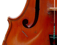 This violin was recently discovered in a remote part of South Africa and rescued from obscurity and certain oblivion. It was in a serious state of neglect, but structurally in excellent condition. It was taken to Amsterdam where it was restored by the important Dutch violinmaker, Andreas Post. Post confirmed the violin's authenticity. He assessed furthermore that the scratches and marks on the front were superficial and of no structural consequence. He in fact refused to restore the marks, stating that they were part of the violin's unique history and "character", and should be left as is.