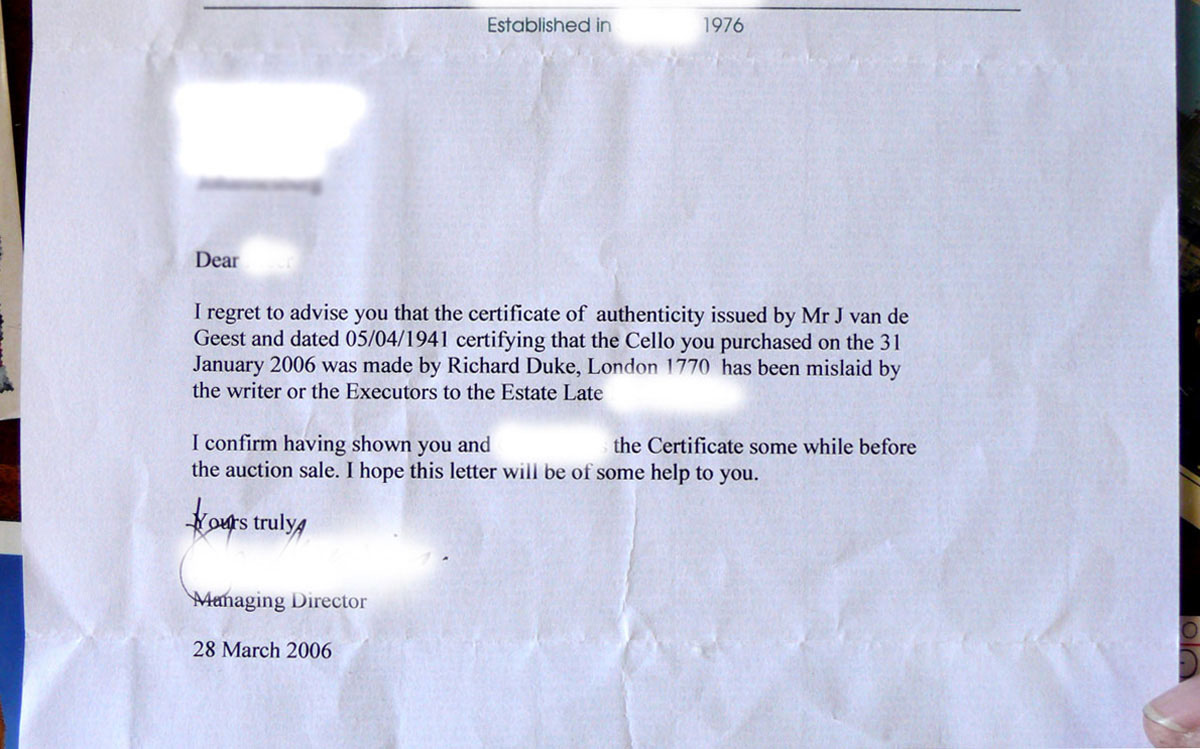 During the auction and sale of this cello some years ago, the original certificate established by J J van de Geest on 5 April 1941, was lost, although it had been shown to the buyer by the auctioneer just prior to the auction. There is an accompanying letter from the auctioneer to the buyer, asserting this fact (see photo).