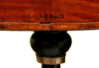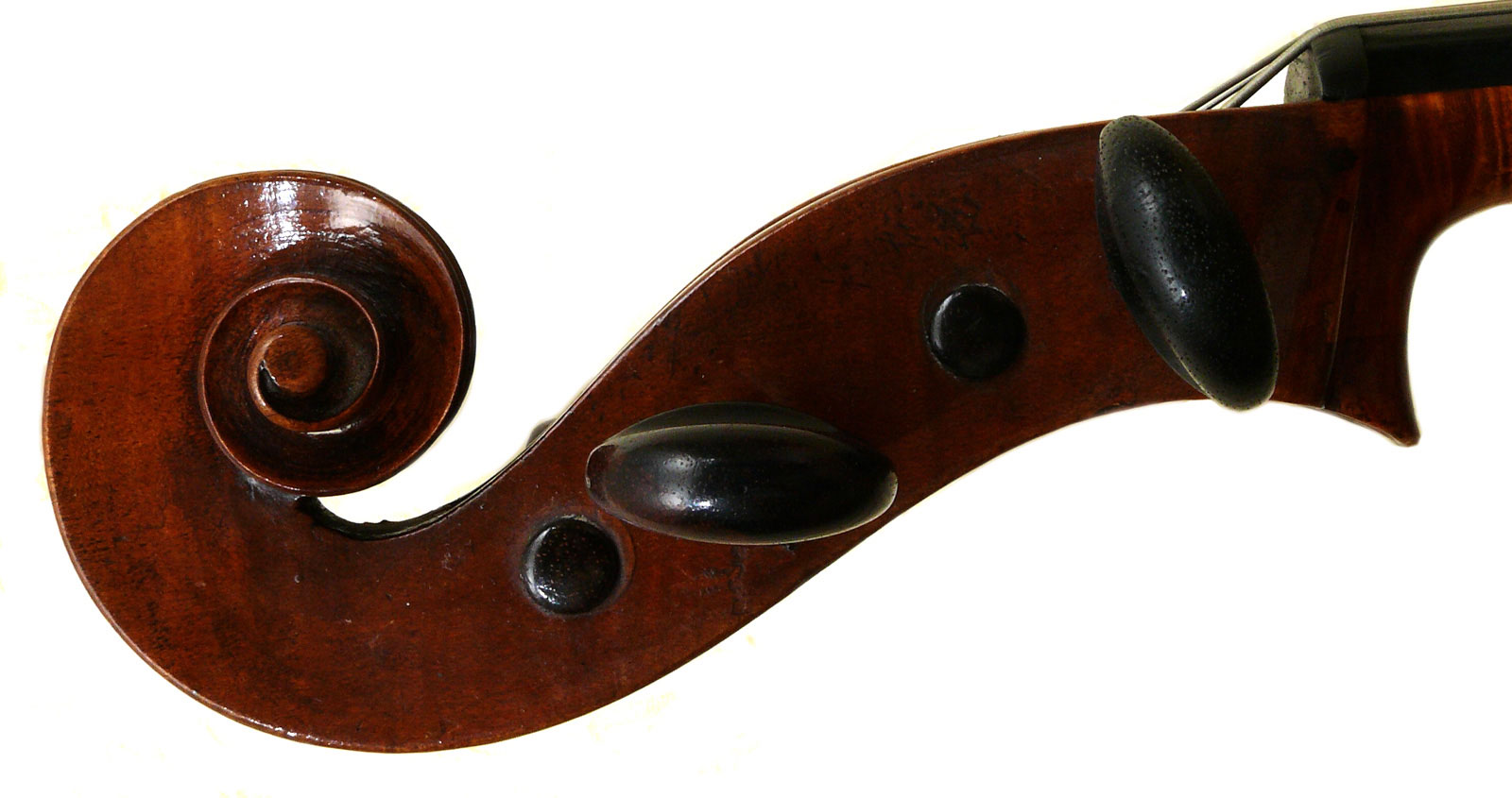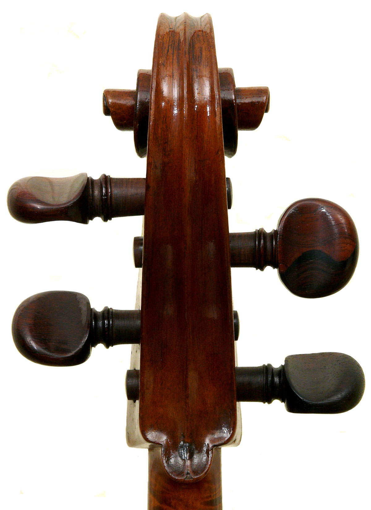 Everything about this instrument conforms to the textbook descriptions of the work of Richard Duke. The scroll and f-holes in particular are perfectly in character and style of the work of Duke. I have recently dealt with a violin by this maker and the scrolls are identical in every aspect. The word London is twice stamped into the back - just below the neck button and near the bottom edge, by the endpin (photos).