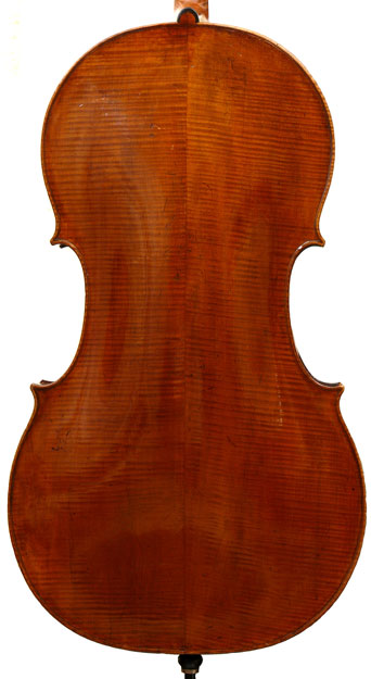 The two-piece back is of finely-curled maple, with a distinct and attractive flame. The ribs are of more broadly curled flame, hence not of the same wood. The top is of fine-to medium-grained tone spruce. Indications in the scroll are that the cello had been subject to at least two new necks (see photo of the graft) which would attest to much use over a long time - a good sign, since only good instruments are played on a lot. The current neck is truly a splendid affair of beautifully flamed wood -well-chosen and attractive and worthy of a fine instrument (see photo).