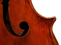 Varnish throughout is of an attractive golden brown with just a touch of red in places. The varnish appears to be original, but may have been touched up slightly in places. A wood replacement about 4 cm wide was made in the table and runs from the bottom of the right f-hole all the way down to the edge. This is extremely well-done and virtually invisible - I only became aware of it after doing the photos and comparing the grain under magnification - excellent craftsmanship.
