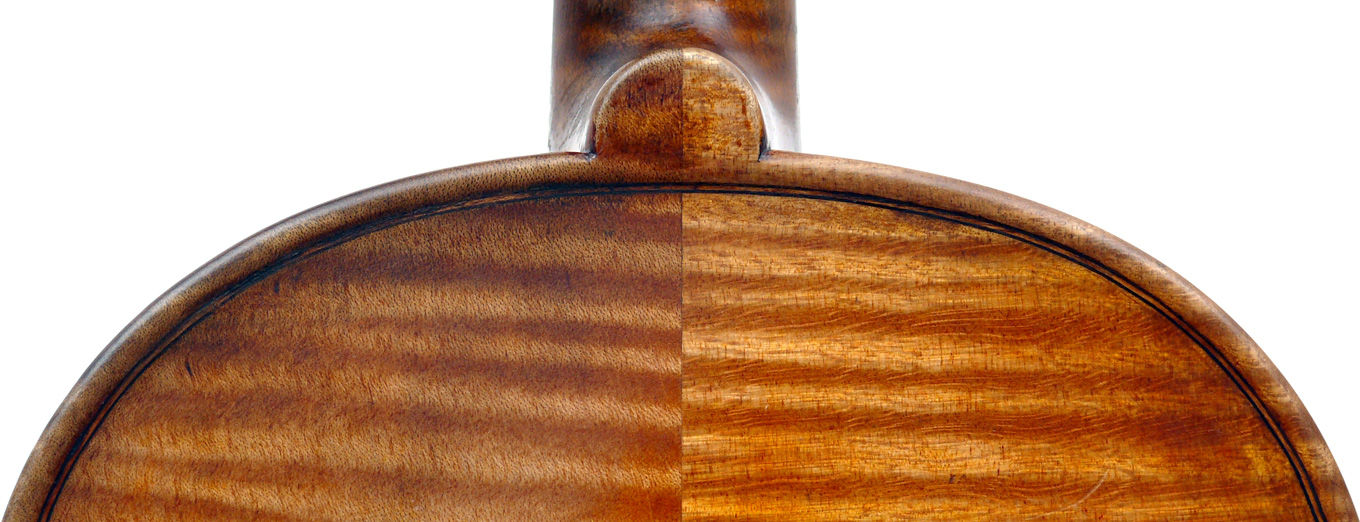 The back is in two pieces of nicely flamed maple with an attractive but irregular curl - the two halves are unmatched. Sides, neck and scroll are likewise of well-flamed maple. The top is of fairly widely-grained tone spruce. The current fittings are of rosewood.