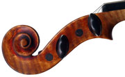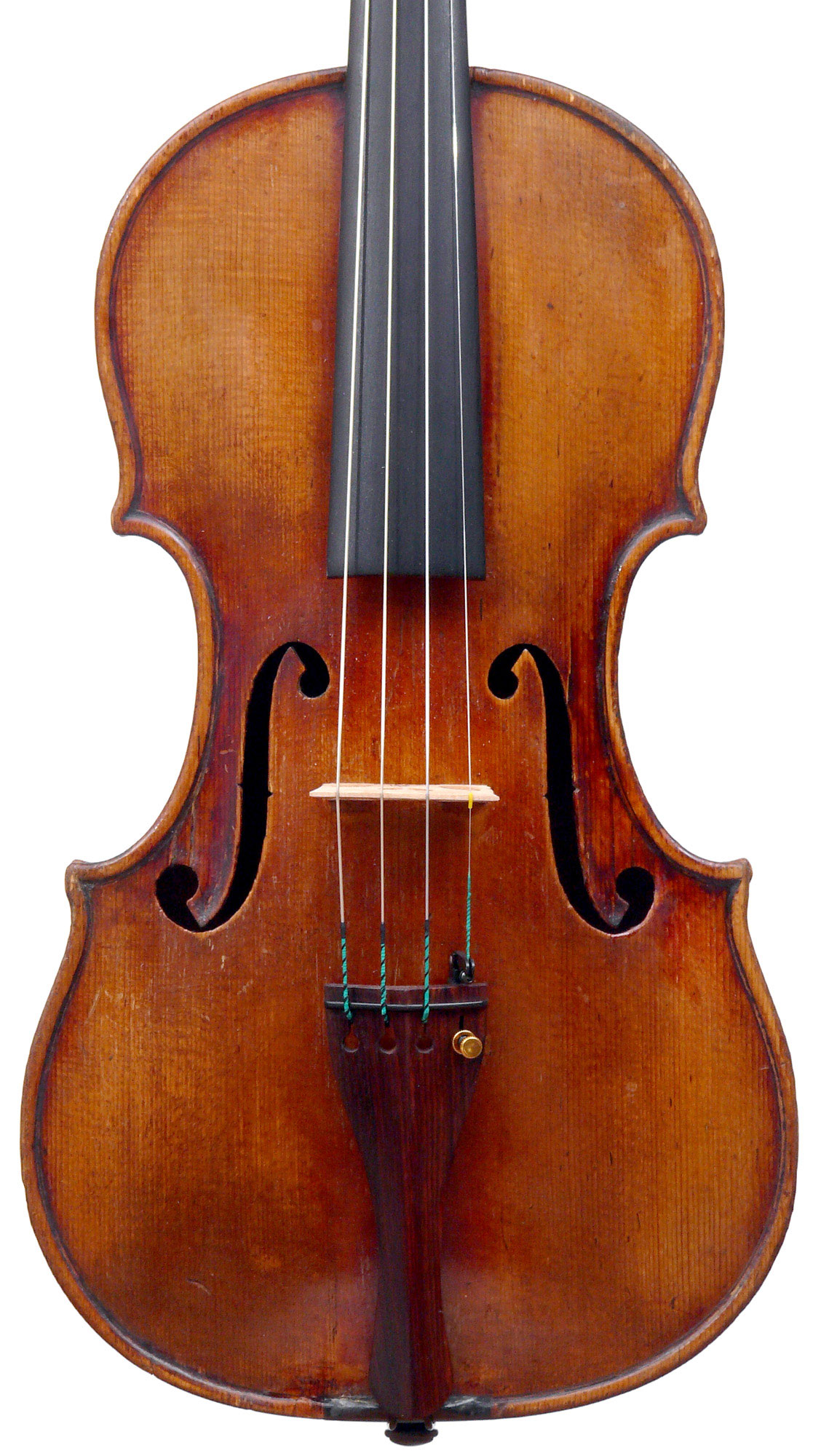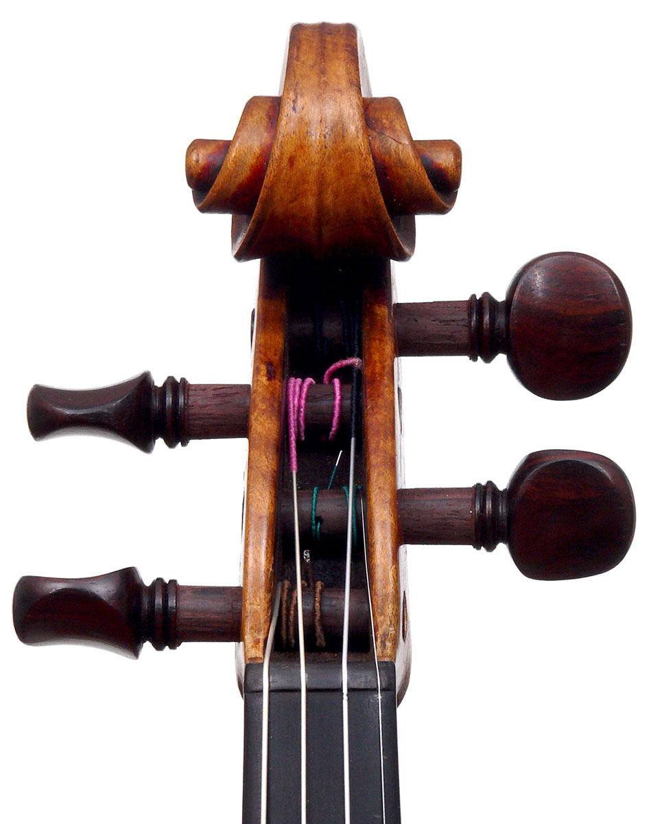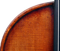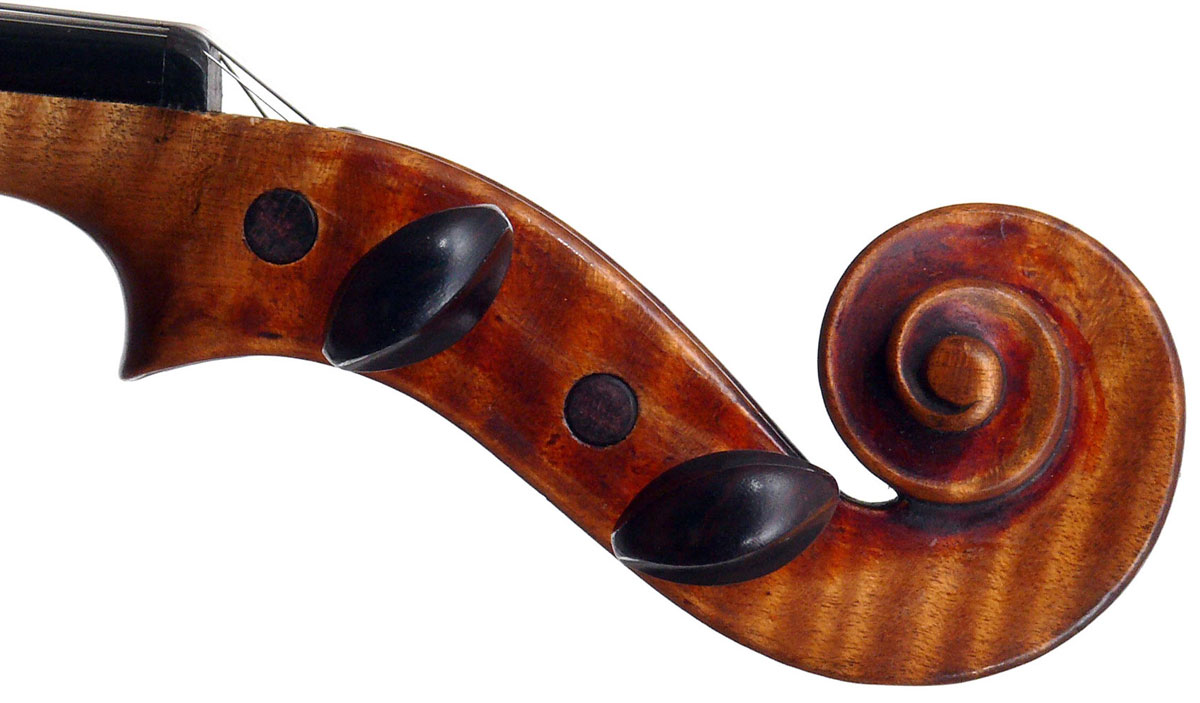This unlabelled instrument is in my view a fine violin and not a trade instrument. Throughout it is made of excellent materials - a beautiful one-piece back of nicely flamed maple with a medium and distinct curl, repeated in the sides, neck and scroll. The scroll particularly is striking in its wood and cut and shows an excellent steady and well-trained hand. The top is of good-quality medium grained tone spruce.