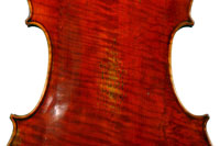 A striking feature of this particular cello is its one-piece back - of nicely flamed maple with a mild medium curl (see photos). This is attractive and desirable, as it is difficult and costly to find a single piece of wood big enough for a complete cello back. And this cello has good tone - even throughout and speaking with openness and responsiveness, easy to play on. The materials are well chosen - the sides appear to be matched with the wood of the beautiful one-piece back, showing attention to detail and to the traditions of good lutherie. Workmanship is very good throughout - tidy work in the corners and purfling neatly traced. Varnish is a strong amber to red-brown oil-based application that really nicely compliments the wood.