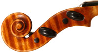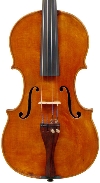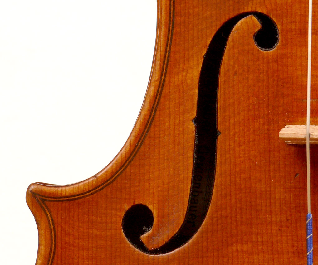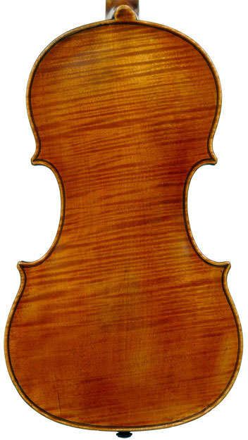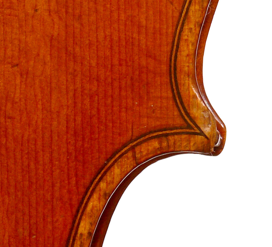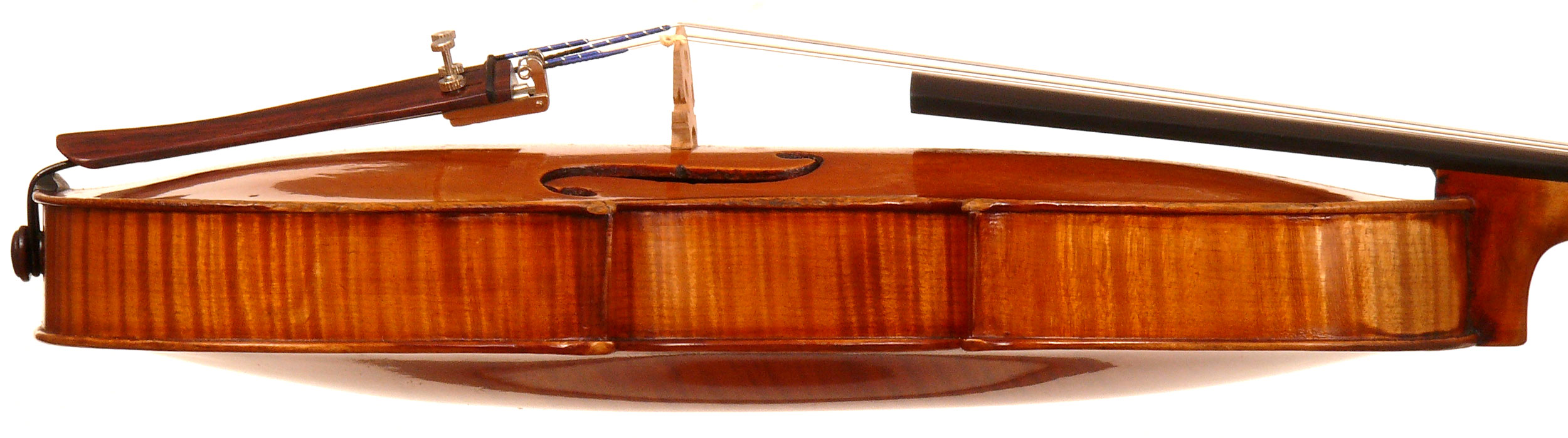 This violin is a very attractive instrument made from a well-chosen selection of wood. The one-piece back is unusually appealing with its distinct richly flamed maple of a medium curl, rising from left to right. The ribs, neck and scroll appear to be of the same material, displaying a rich flame which doesn't fail to seduce. The fine tone spruce top has the unusual feature of a distinct 'bear's claw' marking - a type of cross grain 'flame' which is rare in spruce and which is highly desirable with some makers. The f-holes, or a shorter pattern, are nicely placed and elegant. The arching in the back is distinctly deeper than in the top. Purfling and corner work throughout is very good with a steady hand. The light golden brown oil-based varnish compliments the wood with high transparency, showing off the materials beautifully.