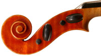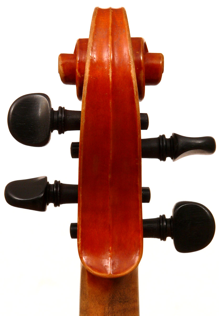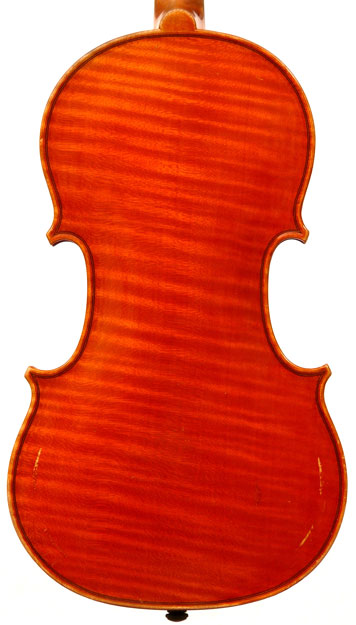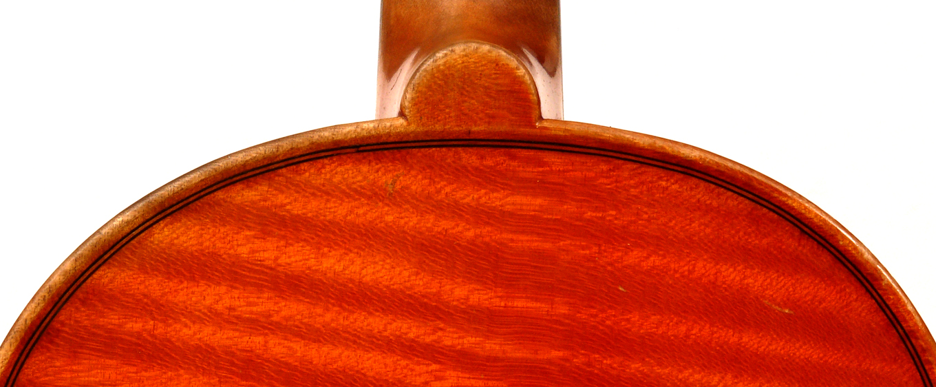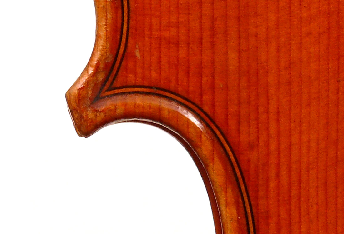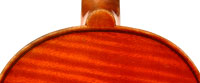 The top is of excellent tone spruce with a straight even medium grain and slight "bear's claw" flame - excellent material. The beautiful one-piece back, ribs, neck and scroll appear to be made from the same mildly flamed medium curled maple. Purfling is impeccable, the scroll nicely balanced and elegant, the f-holes are crisp and refined. What strikes one most about this violin is the unusually transparent varnish - of a beautiful reddish golden color - which allows one not only to see the wood clearly, but lets one see right into the wood - a rare quality in varnish and again showing the mastery of this maker.