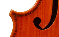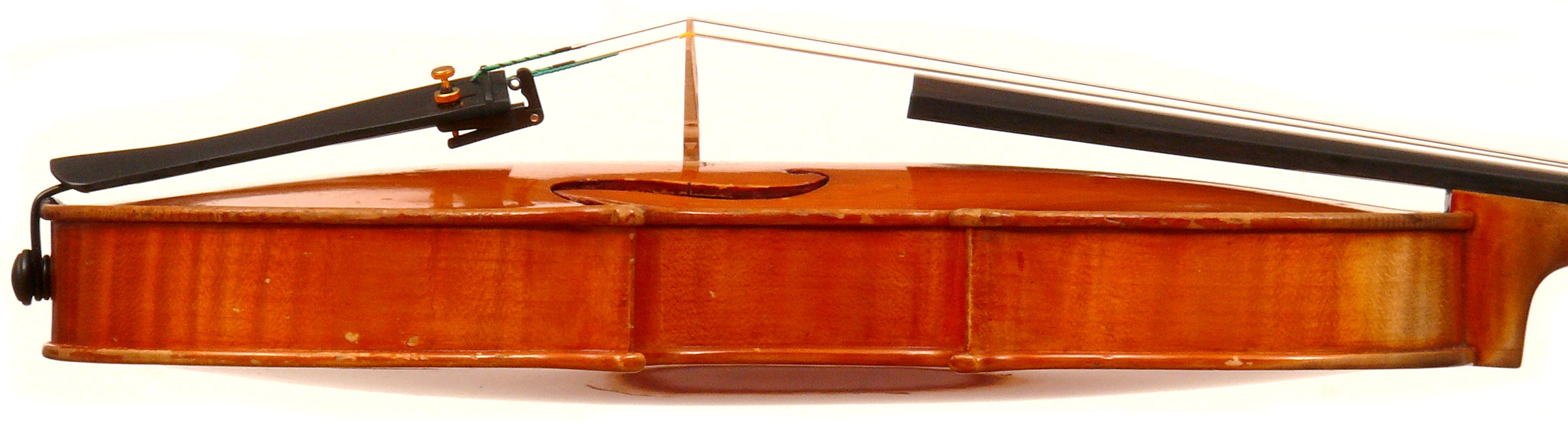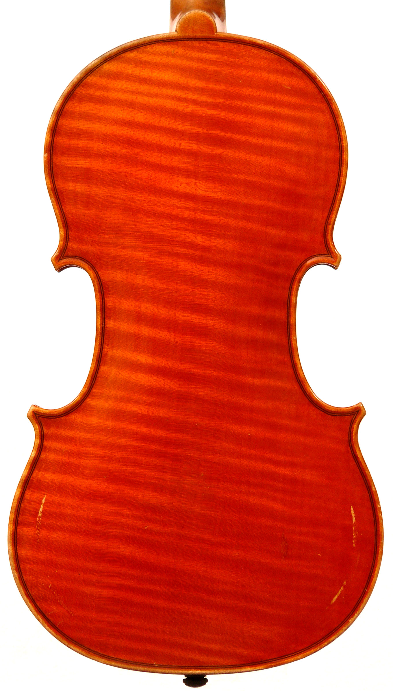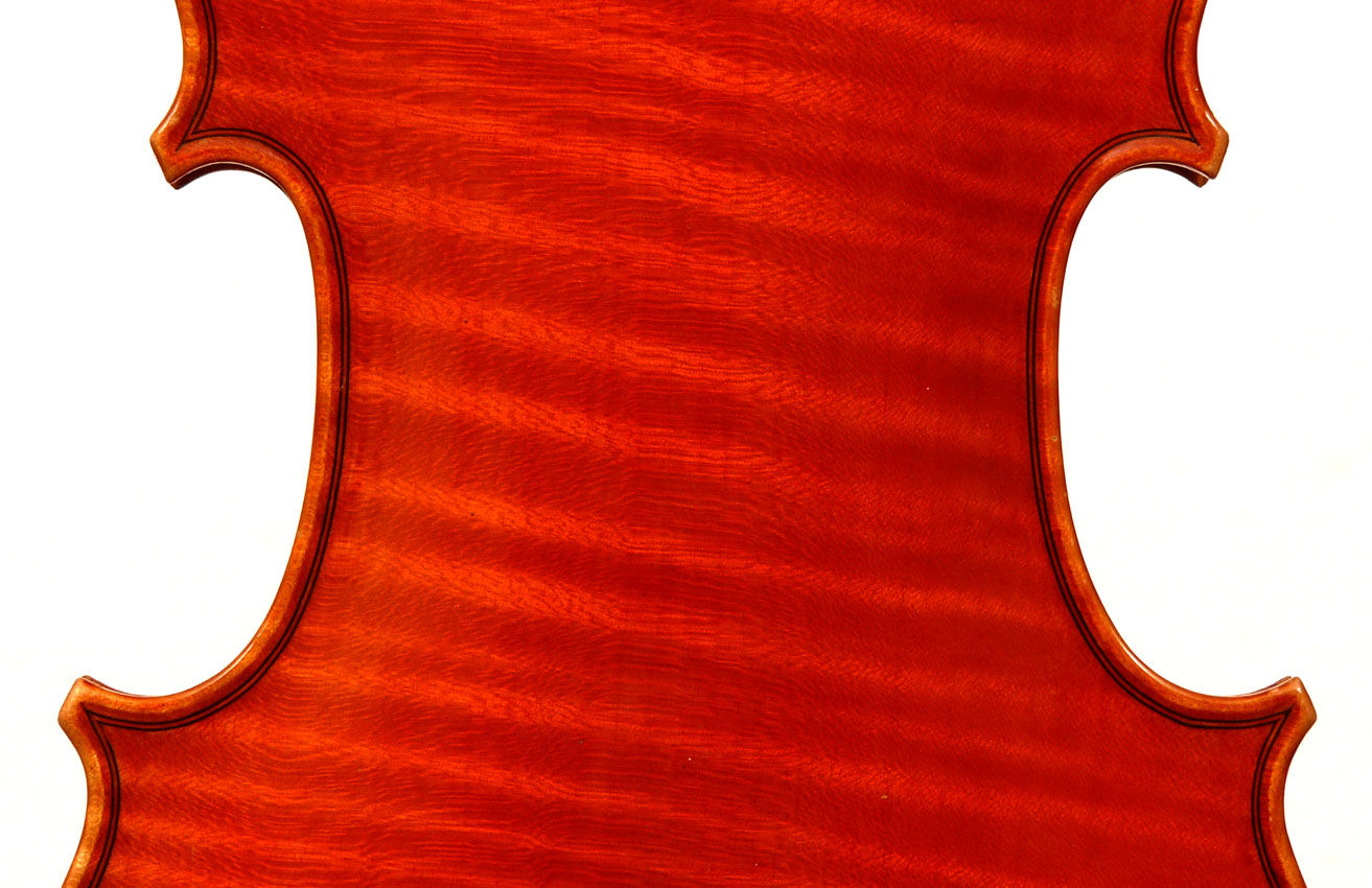 The top is of excellent tone spruce with a straight even medium grain and slight "bear's claw" flame - excellent material. The beautiful one-piece back, ribs, neck and scroll appear to be made from the same mildly flamed medium curled maple. Purfling is impeccable, the scroll nicely balanced and elegant, the f-holes are crisp and refined. What strikes one most about this violin is the unusually transparent varnish - of a beautiful reddish golden color - which allows one not only to see the wood clearly, but lets one see right into the wood - a rare quality in varnish and again showing the mastery of this maker.