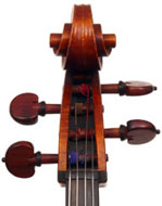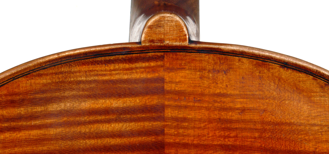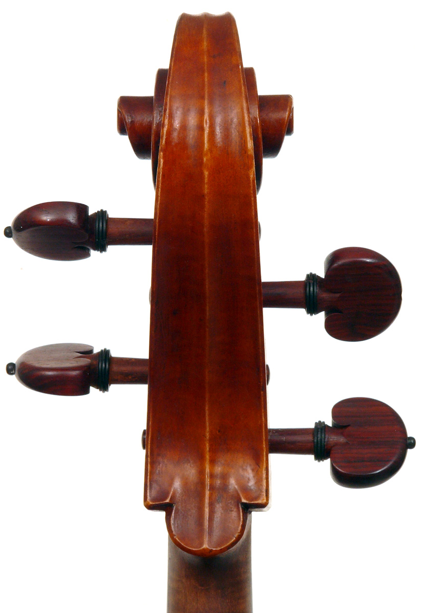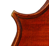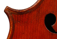 An interesting divergence is that the material for the neck and scroll differs radically inasmuch as it is of exceptionally good, finely curled and nicely-flamed maple. The scroll is very attractive, conforming to a high standard of workmanship - strong yet elegant and finely balanced. The pegbox has been rebushed on all pegs, attesting to a lot of use of this instrument and a good testimony to its excellent properties. The pegs are of rosewood. My personal view is that the neck may later, by another maker, but that remains conjecture.