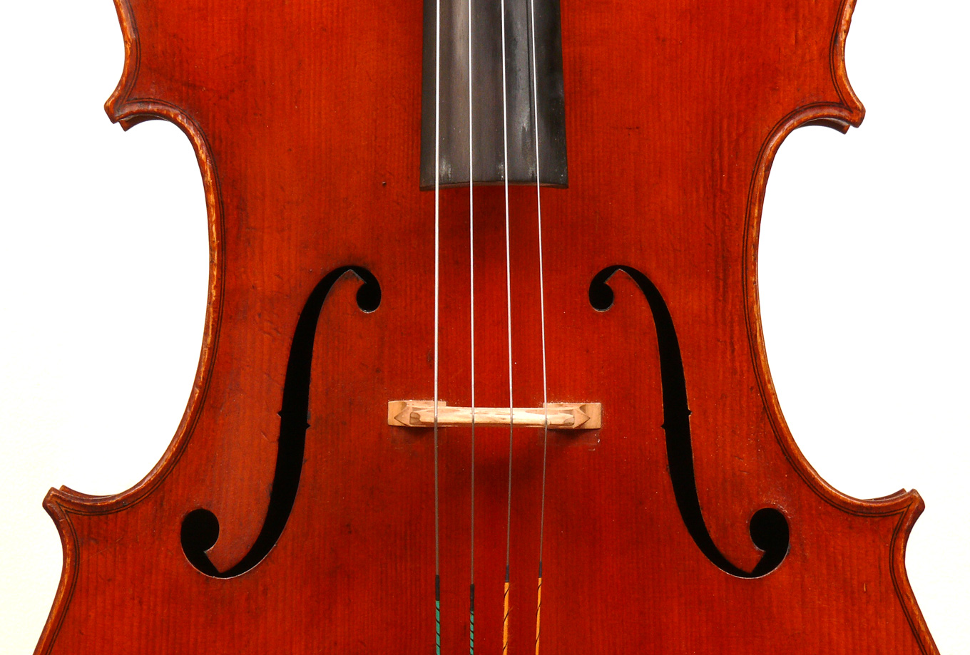 It seems that the cello was made some time between 1920 and 1930. It is well-made and attractive from every point of view. The pale red-brown golden varnish beautifully compliments the materials - a top of fine tone spruce with a medium grain opening to the flanks. F-holes are nicely positioned, somewhat slanted and elegant. Ribs and two-piece back are of maple with a mildly flamed straight medium curl. The purfling is well-traced and elegant with excellent corner work - attesting to a fine and experienced hand.