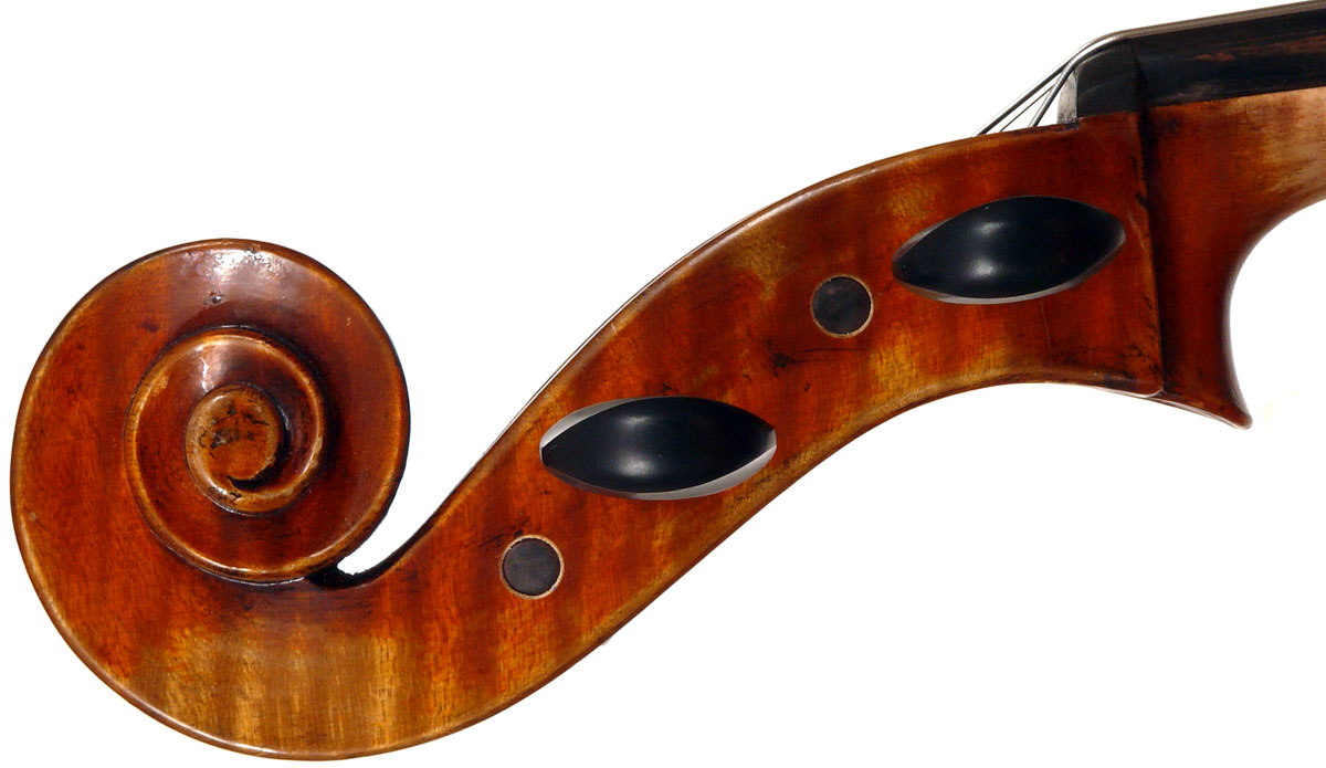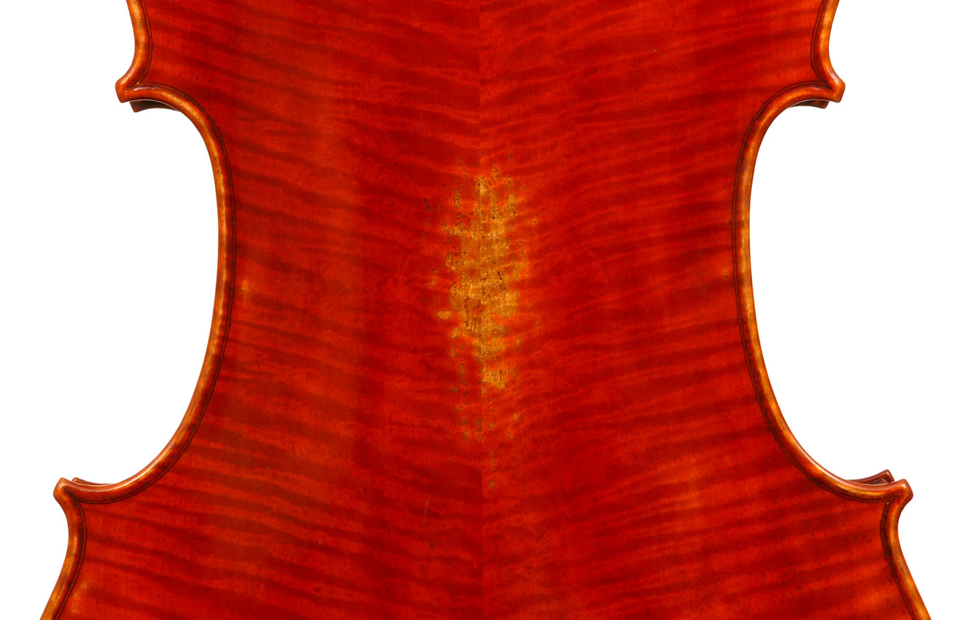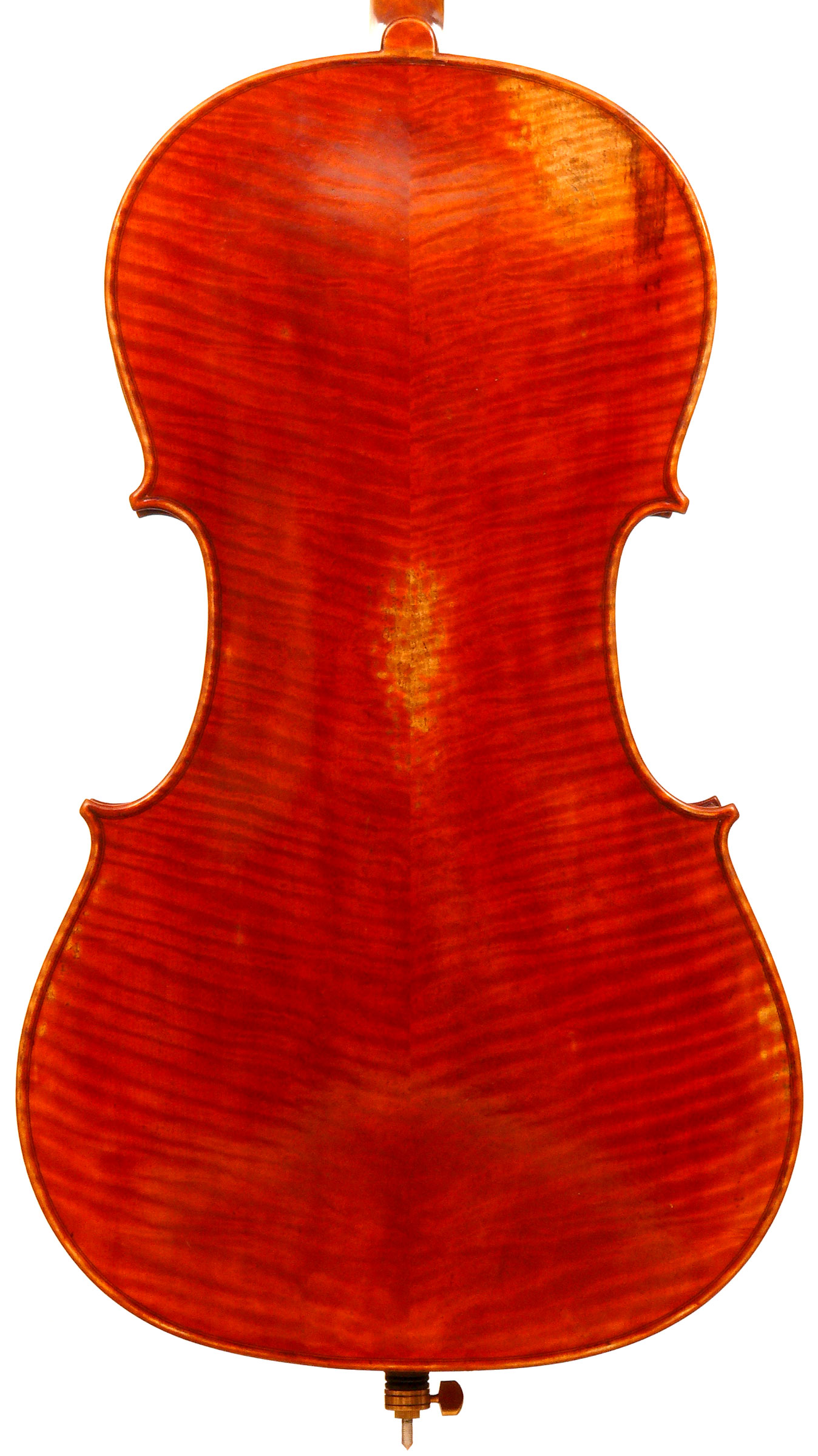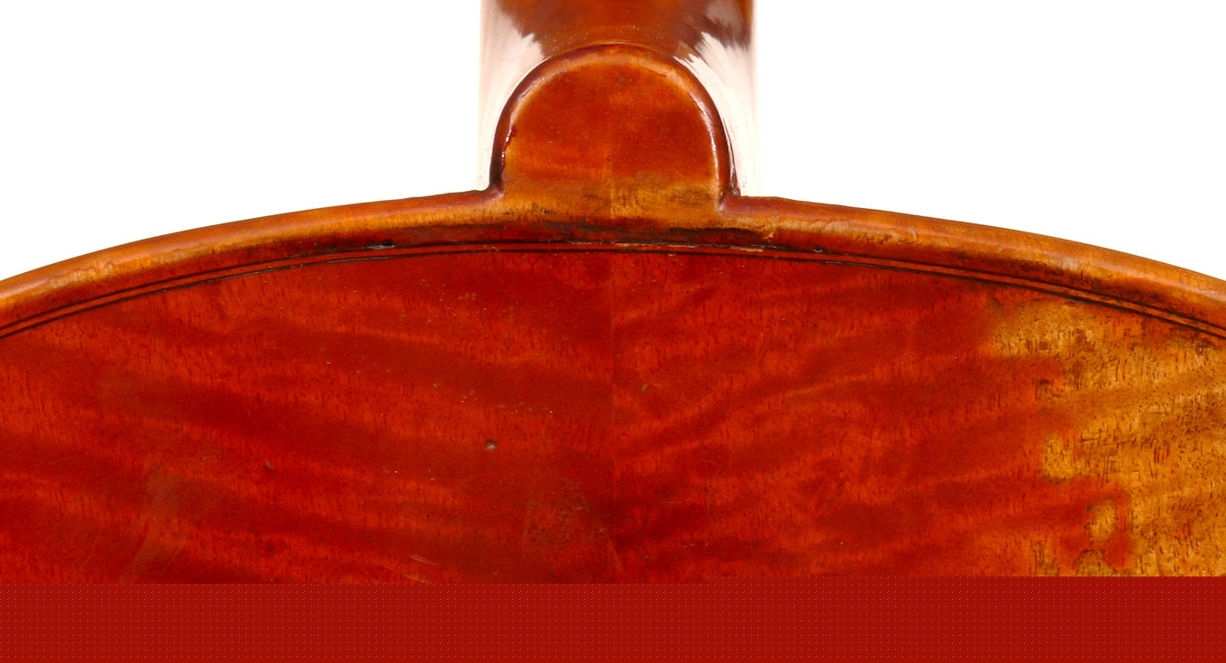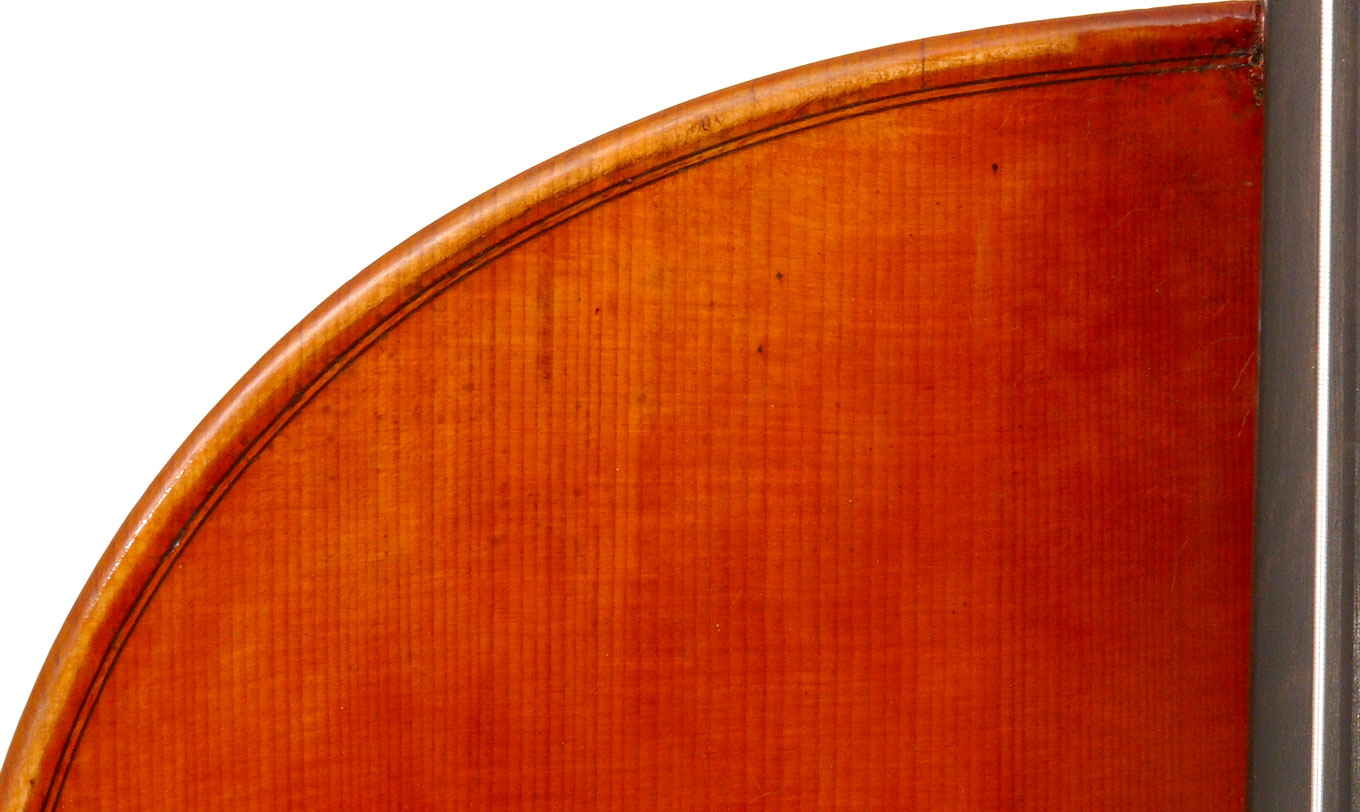 This cello is characterised by a really pleasing tone - even throughout and speaking with openness and responsiveness, easy to play on. The materials are well chosen - a beautiful two-piece back and sides of well-figured maple with a medium curl. A darker mark in the upper right bout is a natural sap mark in the wood and adds character to the instrument. It has no structural implication. Workmanship is very good throughout - tidy work in the corners and purfling neatly traced. Varnish is an amber oil-based application.