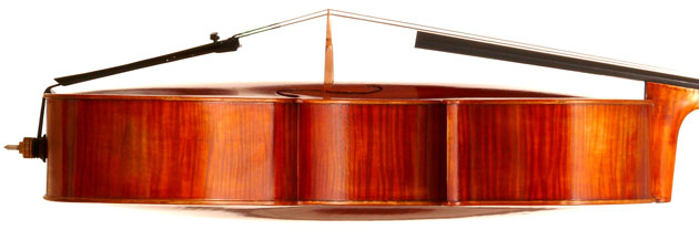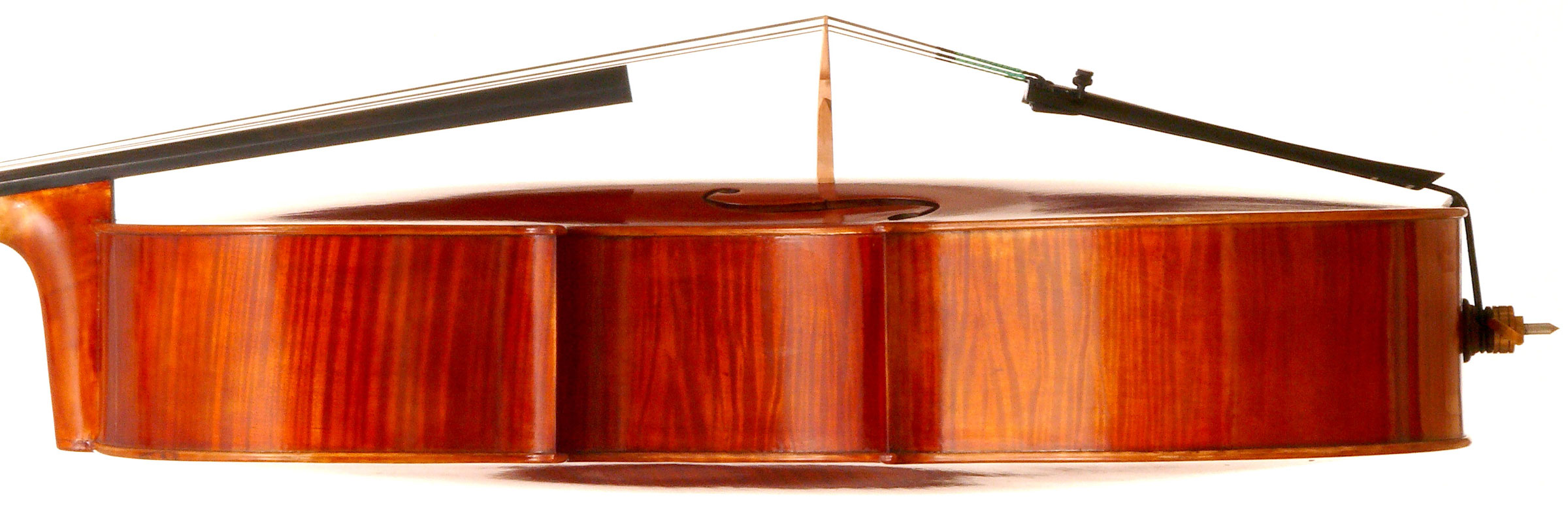 As with the other similar celli on this page, this instrument represents the top-end trade fare that is increasingly establishing itself in the international arena where excellent workmanship, very good tone and fine materials meet in a good, satisfying, responsive and above all, affordable, instrument. These instruments compete with the best output of some leading master instrument builders, providing an accessible alternative to the expensive fine hand made instruments produced in some of the leading European violinmaking studios.