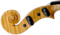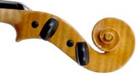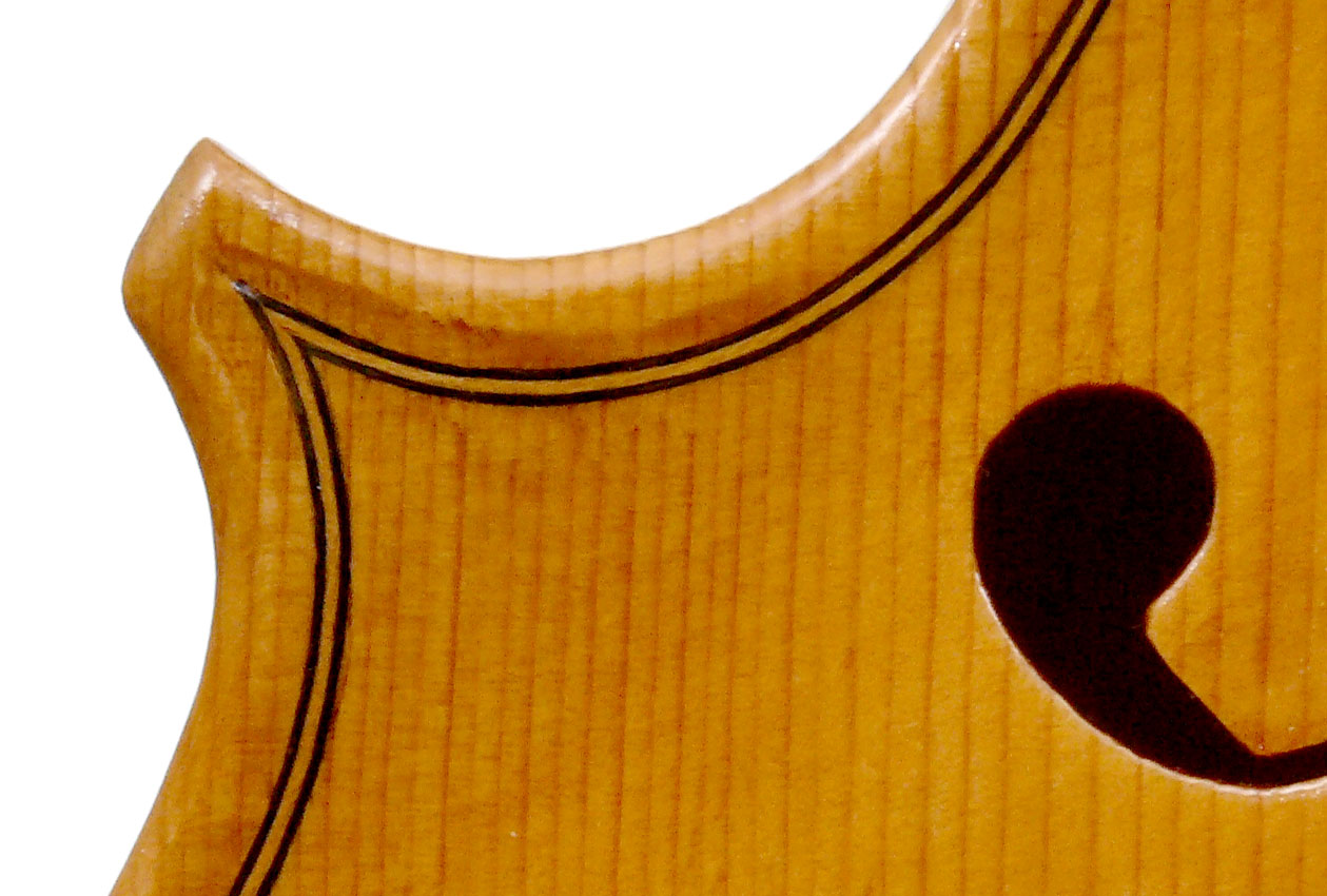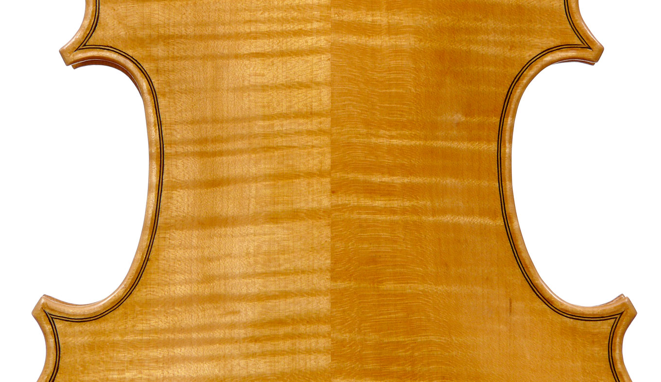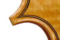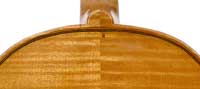 This viola is made of well-chosen and attractive materials - the maple used throughout is nicely figured with a straight and even medium curl producing a distinct flame. The top is of fine tone spruce with very straight medium grain. The oil-based varnish is of a very light-golden honey colour of high transparency, allowing for clear appreciation of the materials. The f-holes show elegance and refinement and the purfling is neatly traced with decent work in the corners.