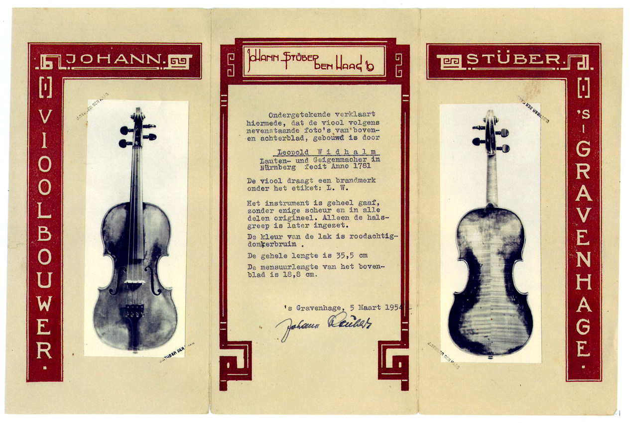 Whatever the case may be, this instrument also bears the two letters L. and W. branded into the back, just below the label - making this almost certainly the work of Leopold Widhalm senior, as stated by the certificate. That, furthermore, makes a strong case for the senior Widhalm's year of death being 1786 and not 1776, when he would have been merely 54.