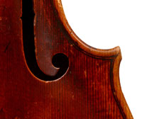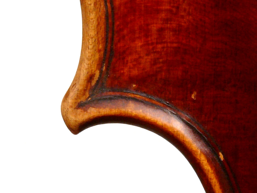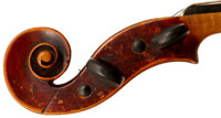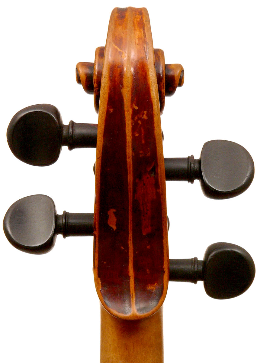 This violin is in superb condition, without a single crack or discernable repair anywhere in the body. The arching and general model is reminiscent of Stainer, but not entirely. The f-holes are crisp and tidy, elegant and balanced. The scroll shows a fine hand and attention to the balance - really beautiful. The top is of finely grained spruce with a very straight grain opening to the flanks. The two-piece back is of mildly flamed maple with a straight medium curl. The ribs have a more narrow flame.